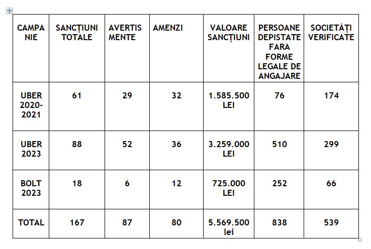 La finalul anului 2020, au fost verificate 174 de firme de transport alternativ la care s-au depistat 76 de persoane care lucrau fara contract individual de munca si s-au aplicat 61 de amenzi in valoare de 1.585.500 lei.
