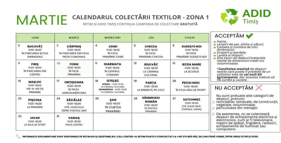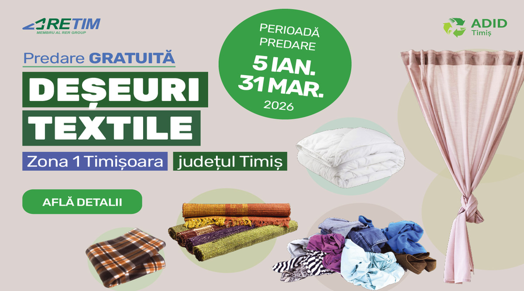 TIMISOARA. Campania de colectare a deșeurilor textile lansată la început de an merge mai departe și în luna martie. RETIM Ecologic Service S.A., în parteneriat cu ADID Timiș, continuă prima campanie trimestrială din 2026 dedicată predării gratuite a textilelor în Zona 1 Timișoara, județul Timiș.