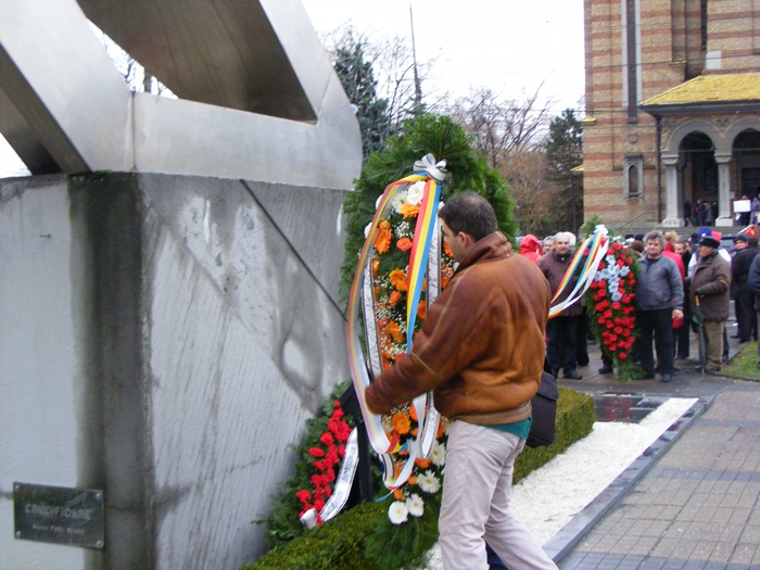 Peste o suta de timisoreni au luat parte la pomenirea eroilor Revolutiei. Membrii Asociatiei 7 Decembrie a Ranitilor si Luptatorilor in Revolutie din Timisoara au depus coroane de flori la monumentul Crucificare, din Piata Victoriei, in fata Catedralei.