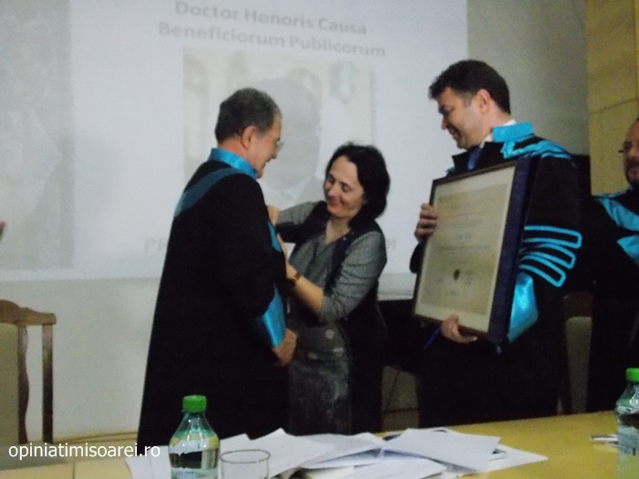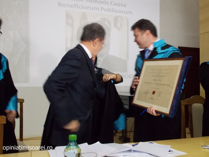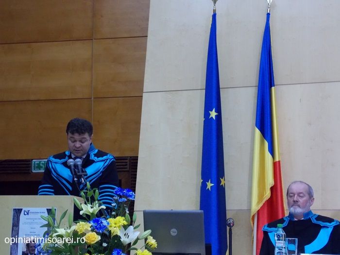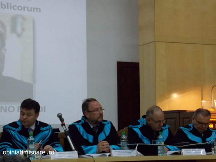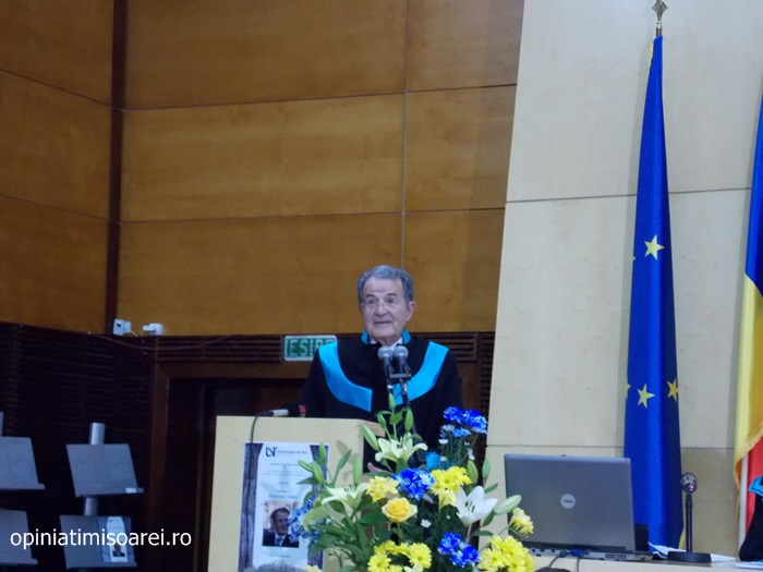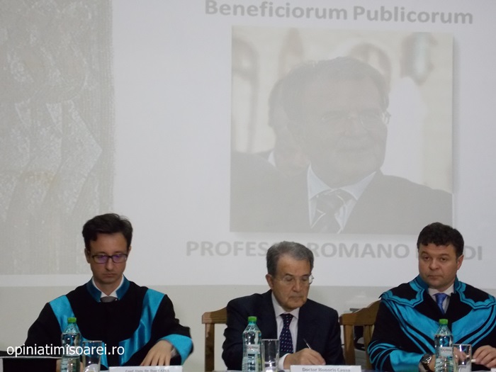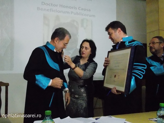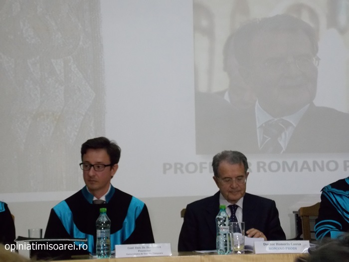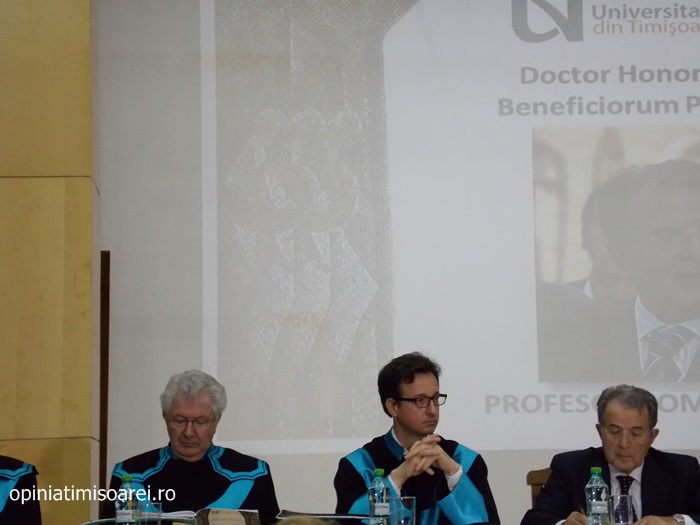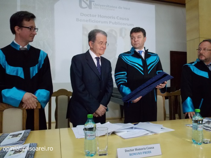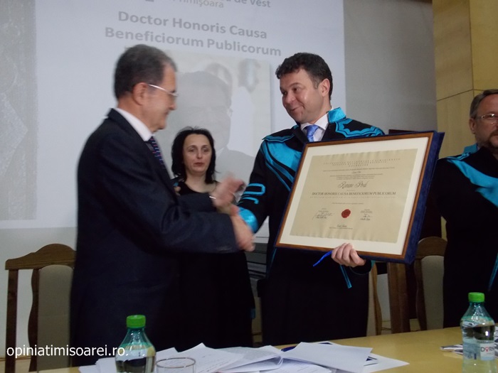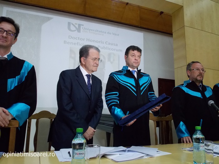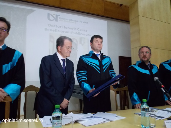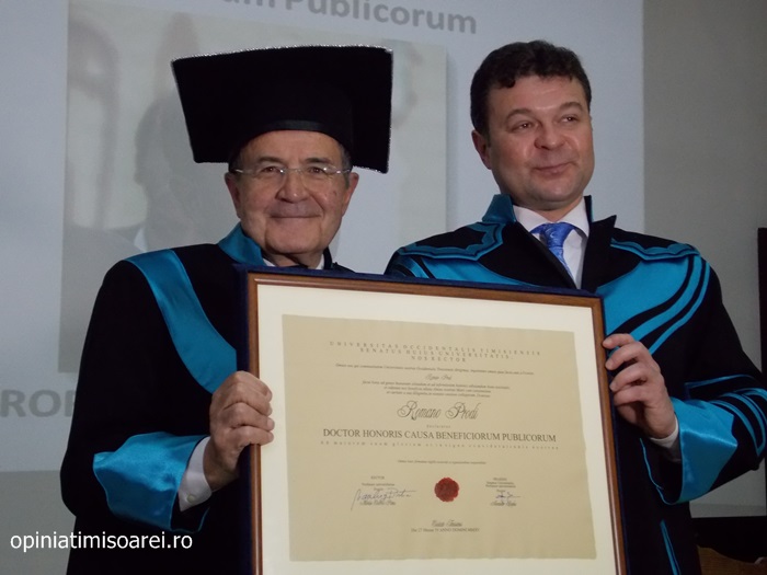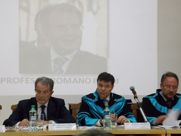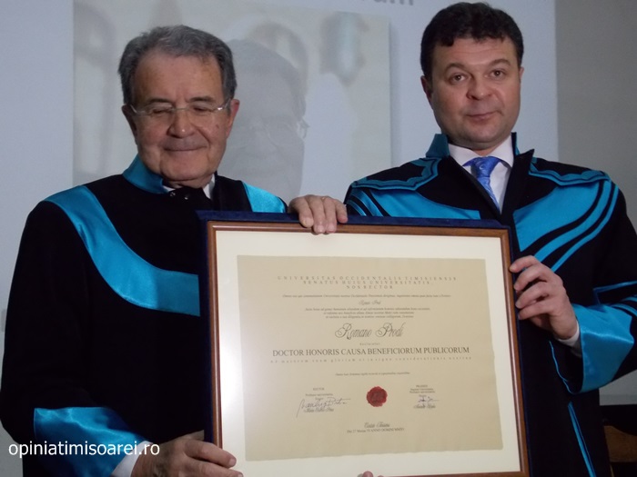 „Comunitatea Academica a Universitatii de Vest din Timisoara este preocupata permanent sa aiba alaturi personalitati complexe, specialisti renumiti si oameni de valoare. De aceea, astazi ne simtim deosebit de onorati sa avem in mijlocul nostru una dintre personalitatile remarcante a vietii publice, academice si politice din Europa. Titlul onorific conferit astazi, Doctor Honoris Causa Beneficiorum Publicorum, reprezinta modalitatea prin care Universitatea de Vest din Timisoara, recunoaste pe deplin meritele deosebite ale domnului profesor Romano Prodi, dovedite in intreaga sa cariera profesionala si politica. Va urez multa sanatate si putere de munca pentru a continua cu aceiasi pasiune activitatea dumneavoastra de profesor si de om politic cu o extraordinara cunoastere a situatiei economice si politice contemporane la nivel global”, spune Marilen Pirtea, rectorul Universitatii de Vest din Timisoara.