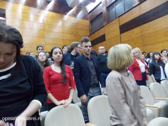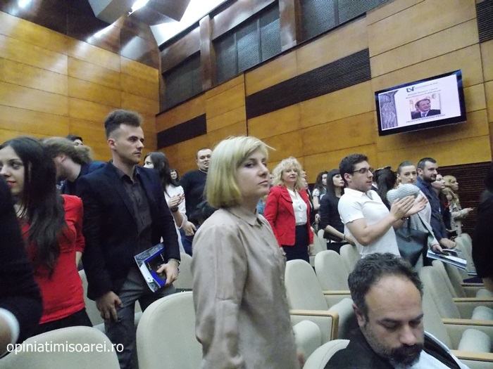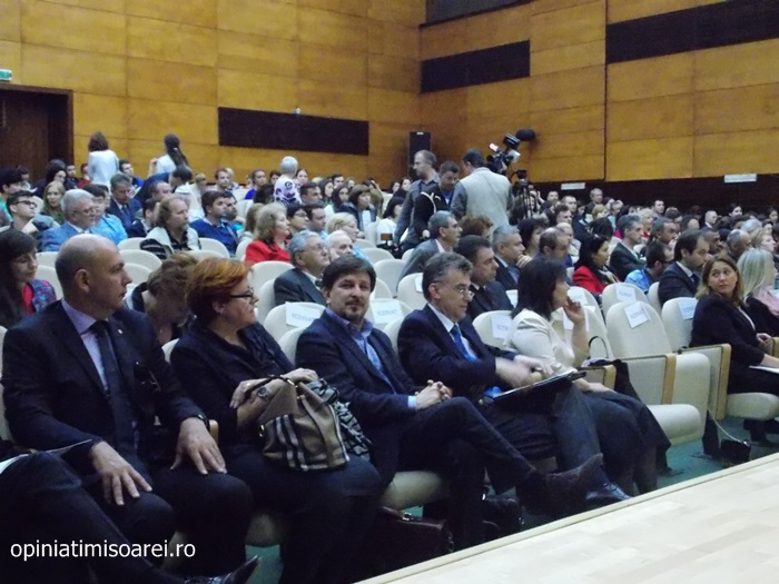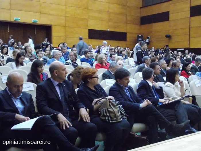 Sala de festivitati a Universitatii de Vest din Timisoara a fost plina ochi de studenti si profesori veniti sa-l vada pe Romano Prodi si sa asiste la eveniment.