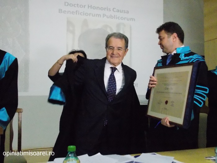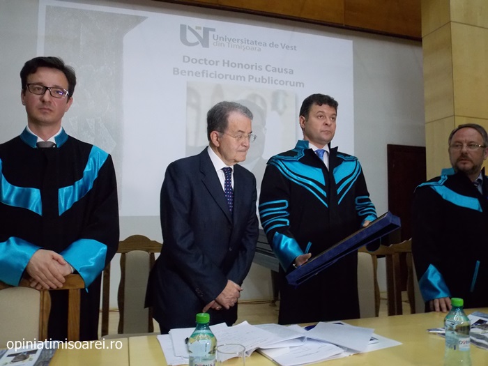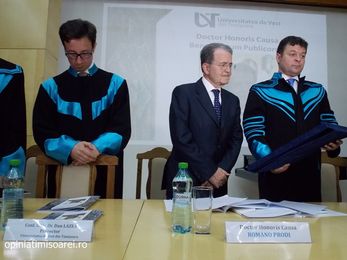 TIMISOARA. Una dintre cele mai importante personalitati politice europene, Romano Prodi, a fost luni la Timisoara. Universitatea de Vest din Timisoara i-a acordat cea mai inalta distinctie academica, titlul de Doctor Honoris Causa Beneficiorum Publicorum.