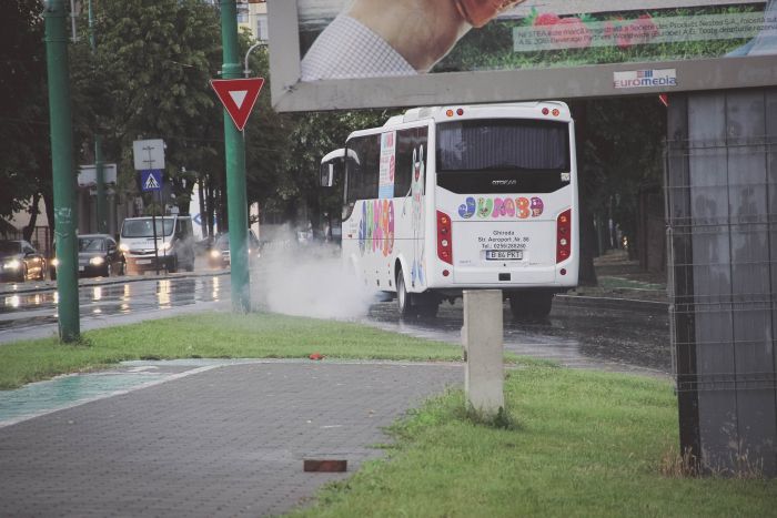 TIMISOARA. A fost din nou furtuna la Timisoara. Vantul puternic a adus nori negri deasupra orasului si, in doar cateva minute, strazile s-au umplut de apa. In unele zone, energia electrica a fost intrerupta din cauza furtunii, iar oamenii stau fara curent de mai bine de zeci de minute.