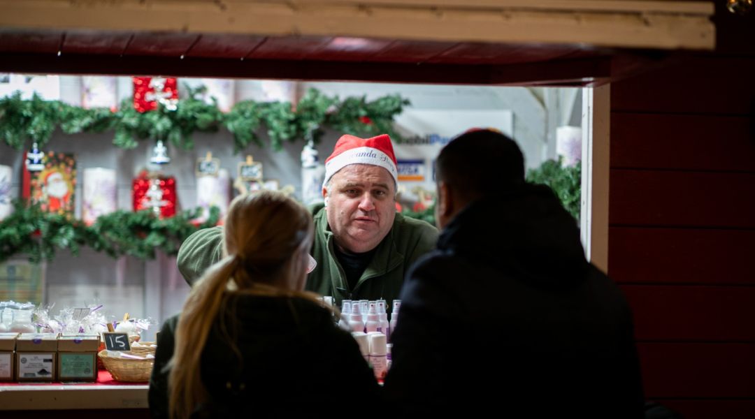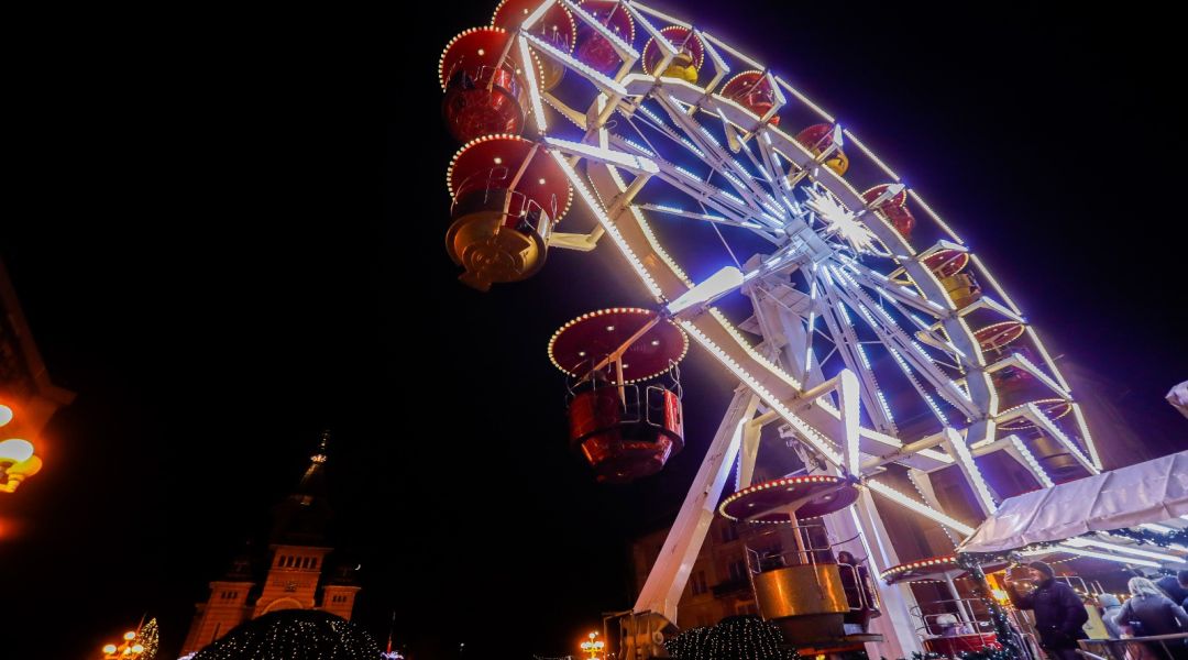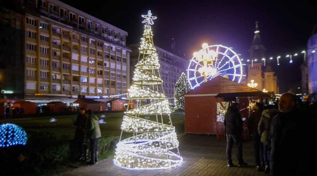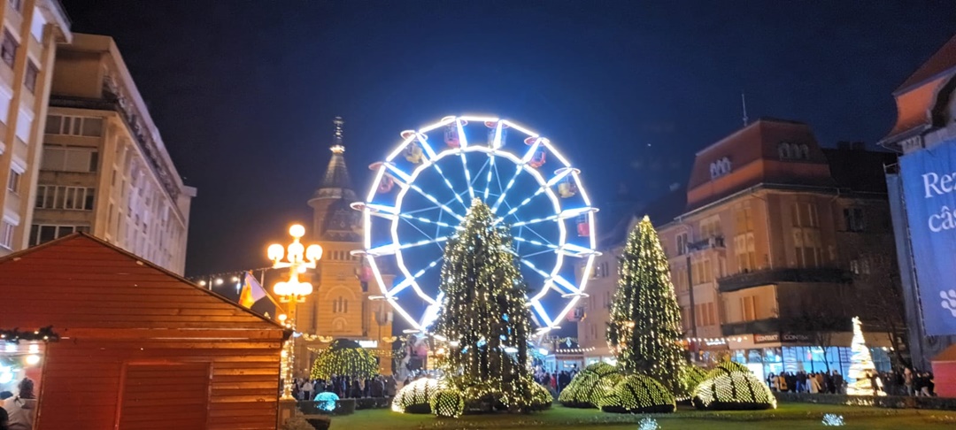 In centrul orasului s-au aprins ghirlandele de luminite, bradul si roata panoramica, caruselul, iar casutele, rosii de asta data, si-au deschis tejghelele oferind timisorenilor bunatati de tot felul, ornamente de Craciun si cadouri.