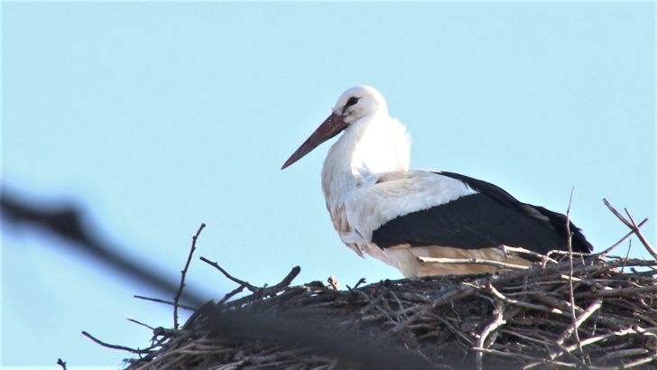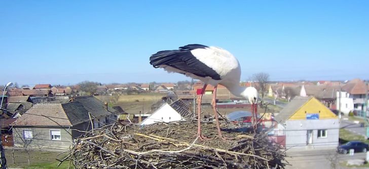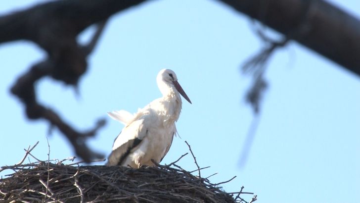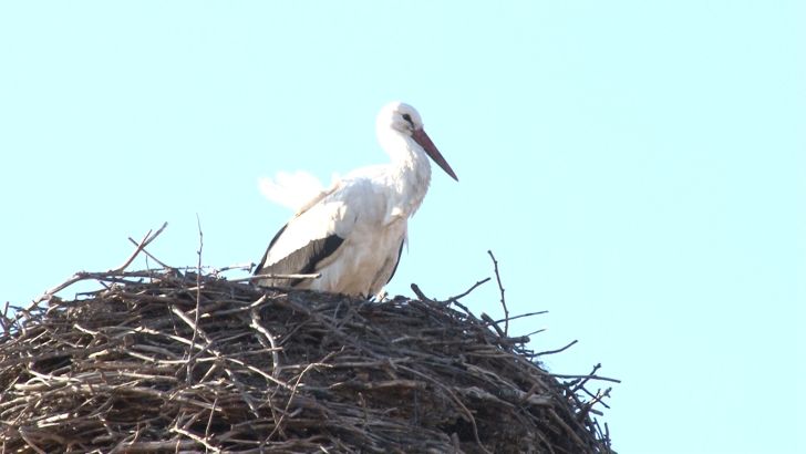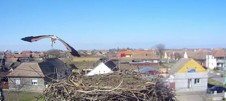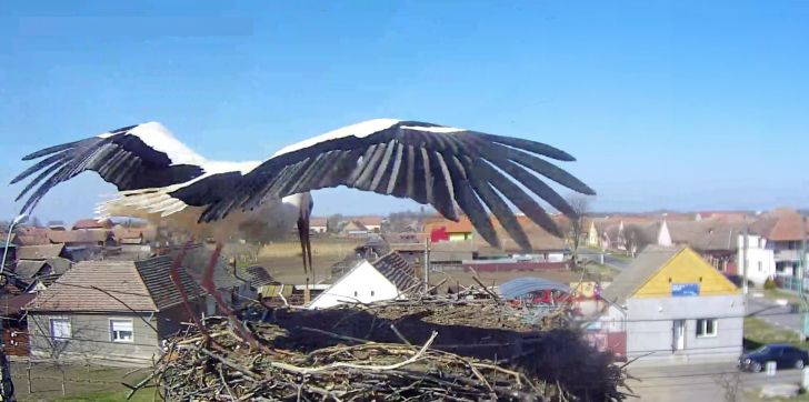 Barza a ramas cateva minute in cuib si s-a odihnit dupa lungul drum tocmai din Africa, dupa care si-a luat din nou zborul in cautare de hrana.