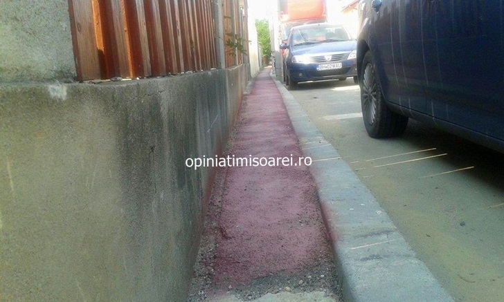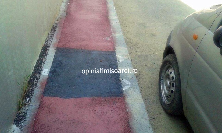 TIMISOARA. O galeata de vopsea a rezolvat problema celei mai inguste piste de biciclete din Timisoara, daca nu chiar din Romania. Vorbim, evident, despre traseul pentru biciclisti de pe strada Gheorghe Cotosman, care masoara, in cel mai ingust loc, nici mai mult nici mai putin de 35 de centimetri.