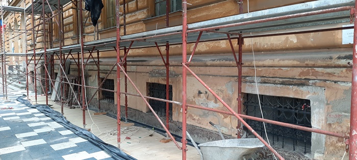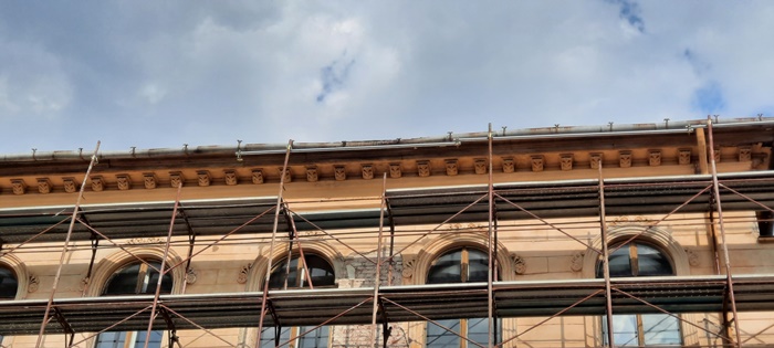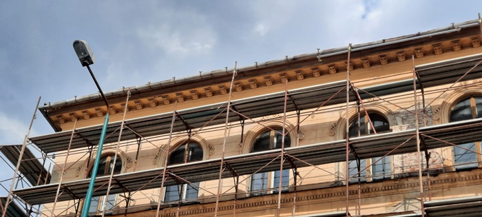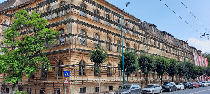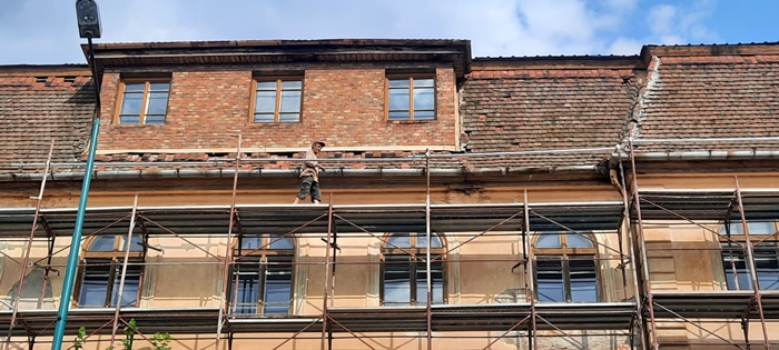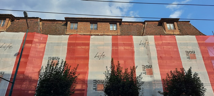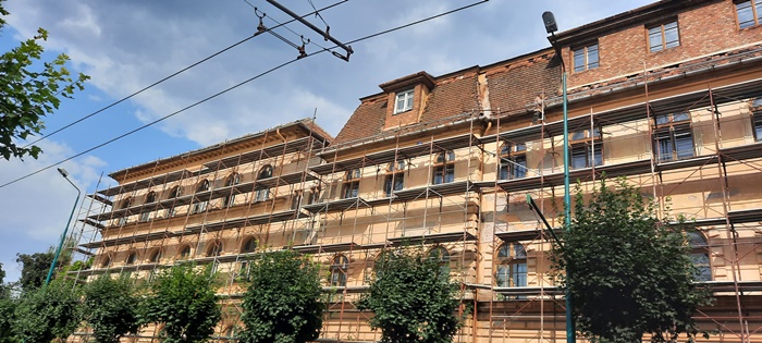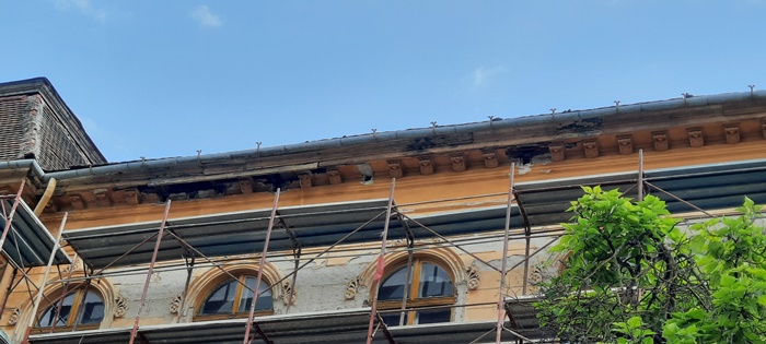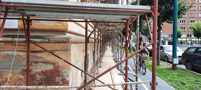 Pe fatada dinspre strada 20 Decembrie schelele au fost deja montate pana la nivelul acoperisului, peste jumatate din aceasta distanta fiind pusa si plasa de protectie.