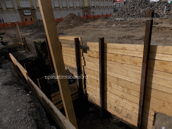 Santul cu apa al fortificatiei turcesti scos la lumina de cercetatori in Piata Unirii din Timisoara este foarte bine conservat, deja arheologii au gasit si bustenii de stejar care protejau acest sant ridicat din pamant si caramida.