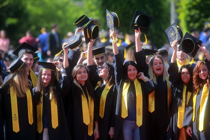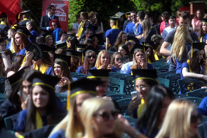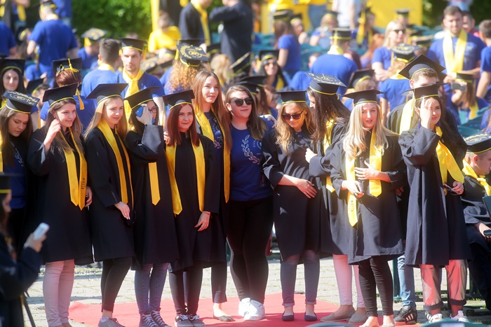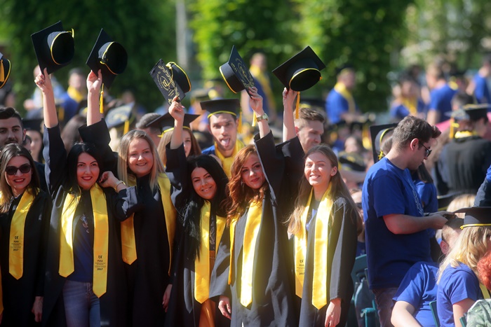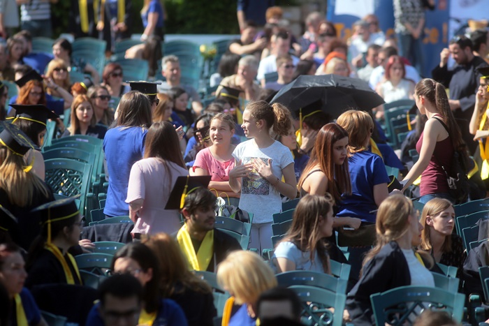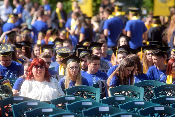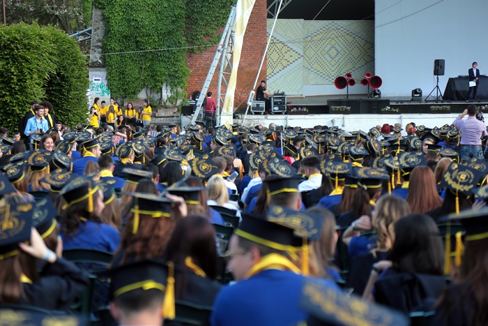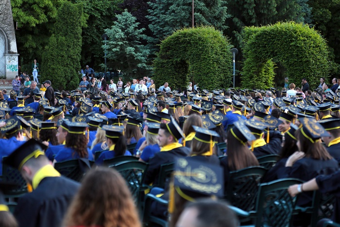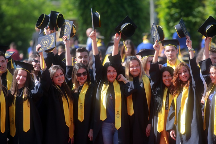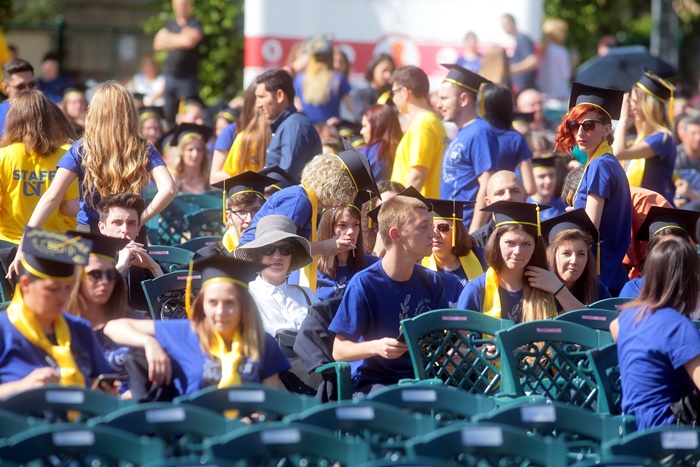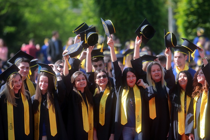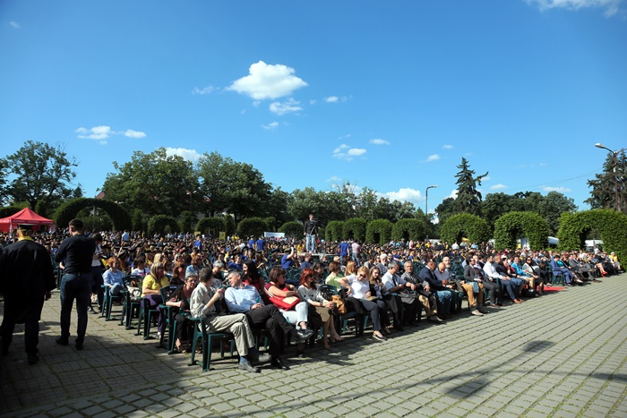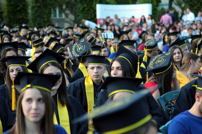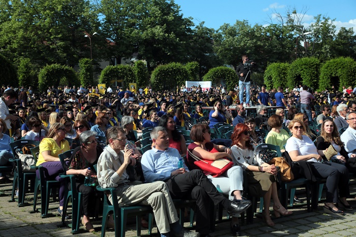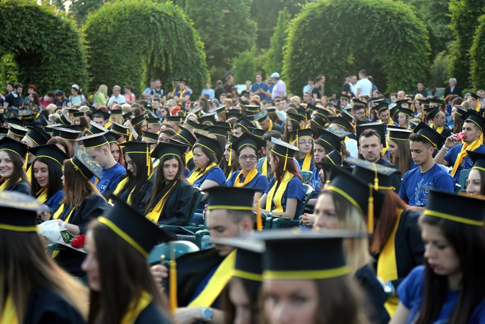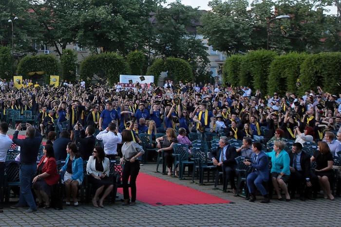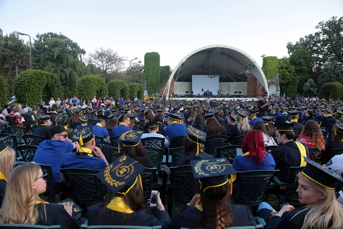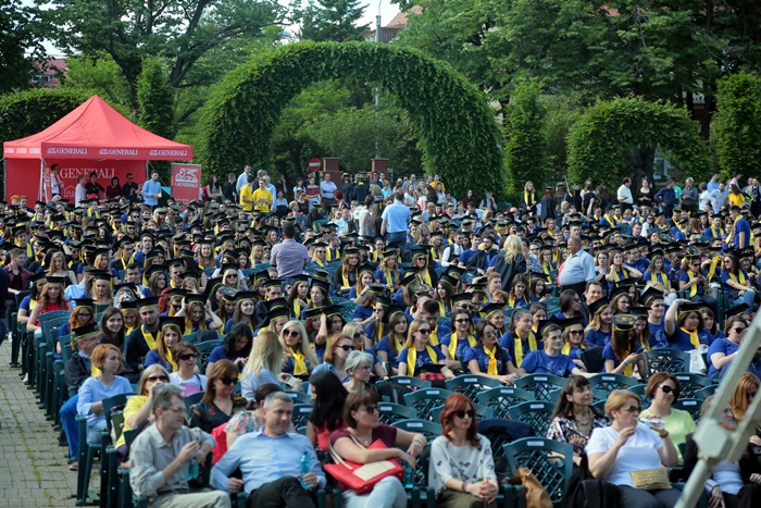 TIMISOARA. Imbracati in robe si purtand toci deasupra capului, plini de emotie si speranta, absolventii facultatilor din cadrul Universitatii de Vest din Timisoara s-au adunat miercuri la un eveniment important din viata lor – Ceremonia de absolvire si de intrare in comunitatea de alumni.