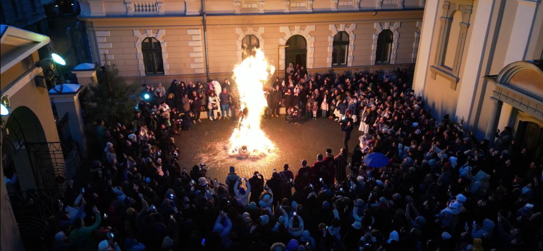 Au fost flăcări uriașe, ploaie de scântei și colinde la Biserica sârbească din centrul istoric al Timișoarei. Zeci de sârbi s-au adunat să participe la ritualul din Ajunul Crăciunului.