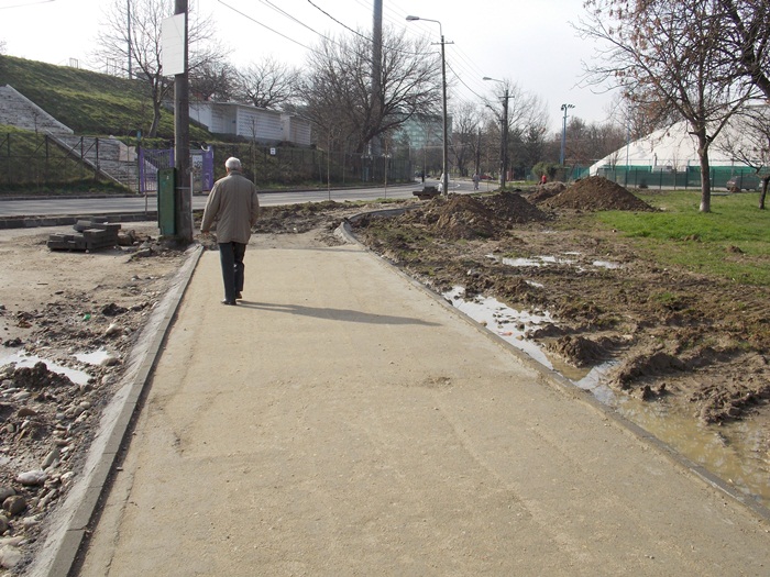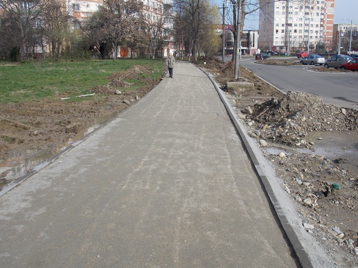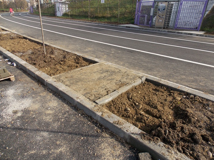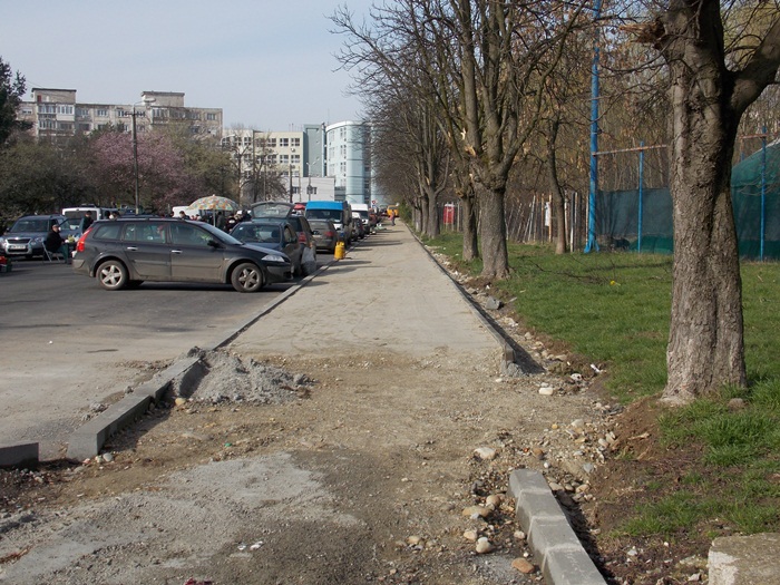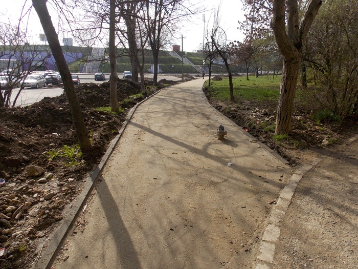 Tot in zona stadionului, dar peste scuarurile in care au fost plantati salcami, intre acestia, au fost deja facute alei de piatra ca sa se poate trece dinspre parcare catre pistele din jurul arenei.