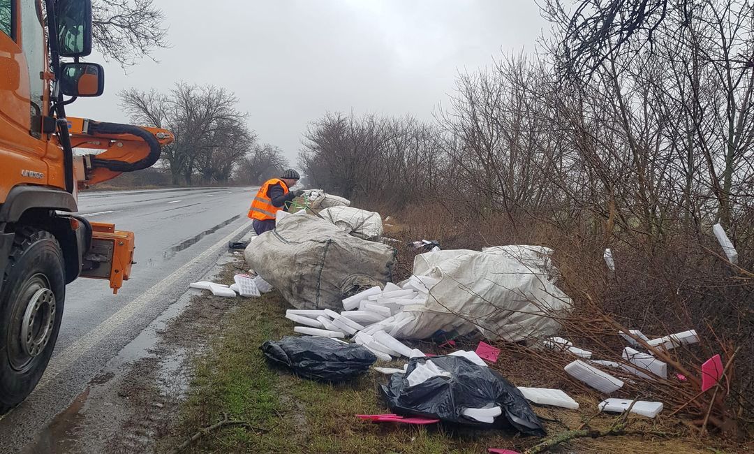“Transportul a plecat din Timișoara, dar pe drum șoferul ”a pierdut” câțiva saci de mari dimensiuni și nu s-a întors să îi recupereze. Sacii sunt umpluți cu bureți pentru ambalaje și au fost depozitați momentan la marginea drumului.