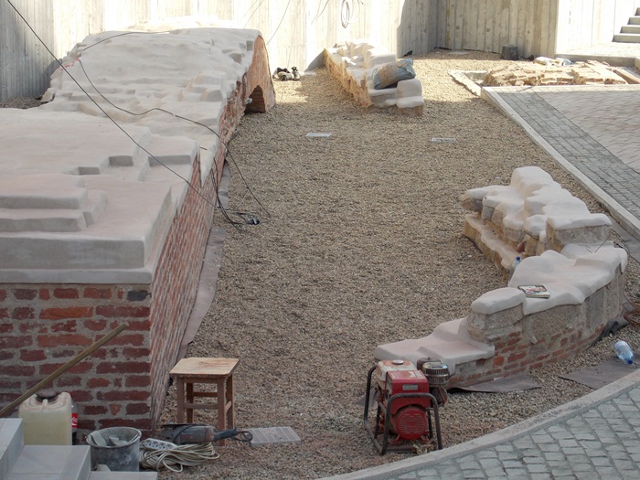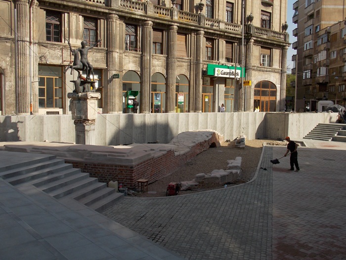 La statuia Sfantului Gheorghe au fost taiate deja bucatile metalice folosite la mutare, iar pe langa soclu, pana la nivelul solului, vor fi montate placi de travertin.