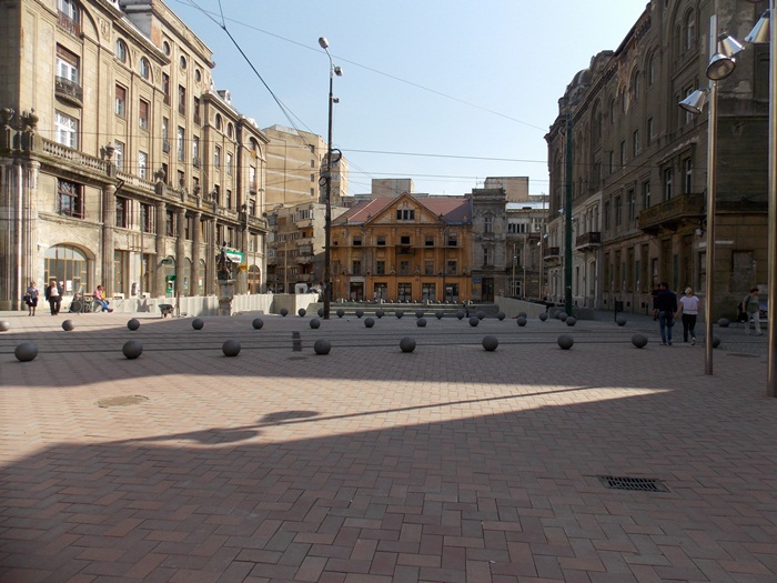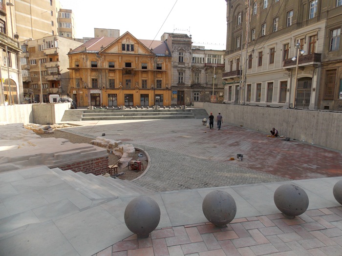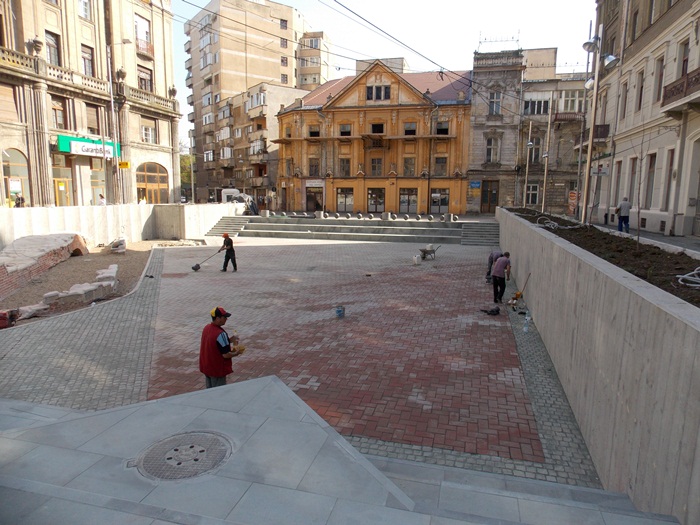 TIMISOARA. S-a ajuns la curatenie! Piata Sfantul Gheorghe este din ce in ce mai aproape de finalizare. Muncitorii fac ultimele finisari, iar in piata a aparut si o placheta metalica, pe care sunt reprezentate vestigiile istorice din zona.