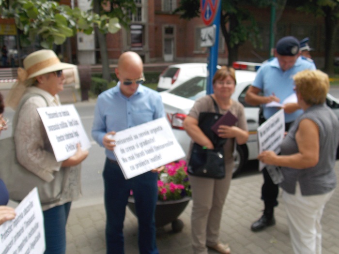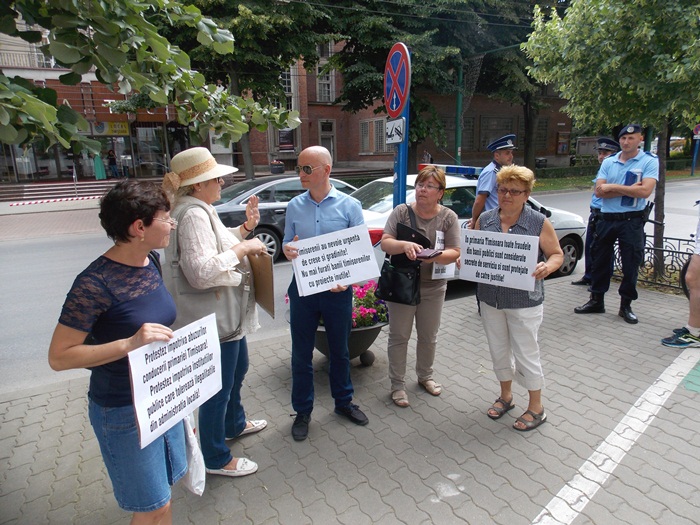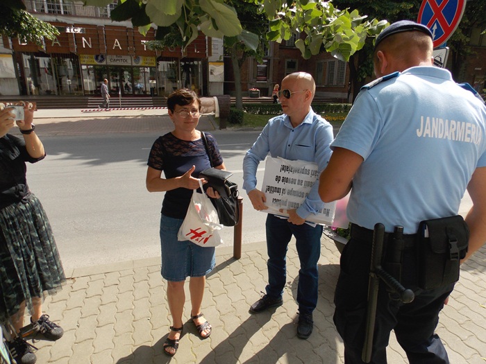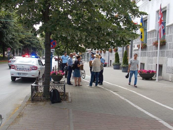 Pe langa cei cativa prieteni ai functionarului, la protest a fost prezenta si o patrula de Jandarmerie, si un echipaj al Politiei Locale, care au legitimat-o pe femeie.