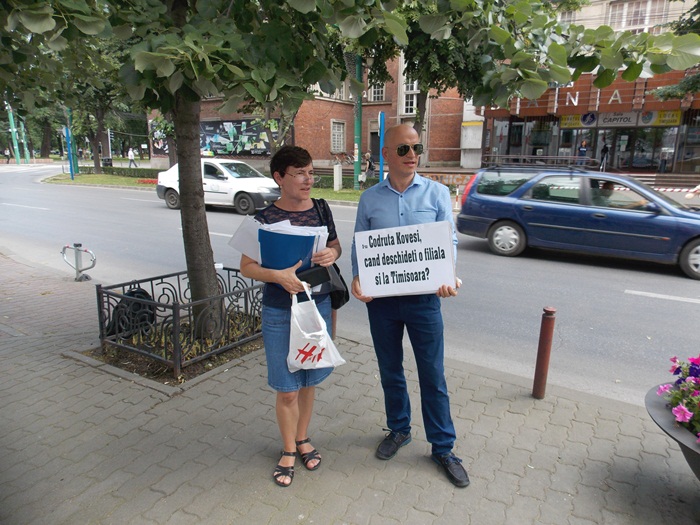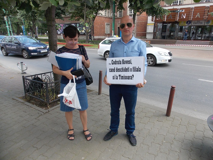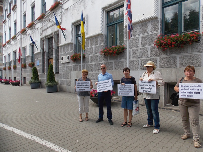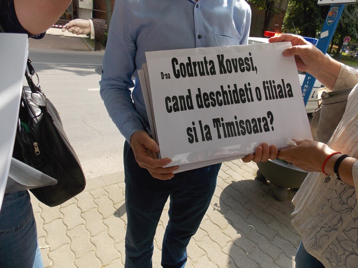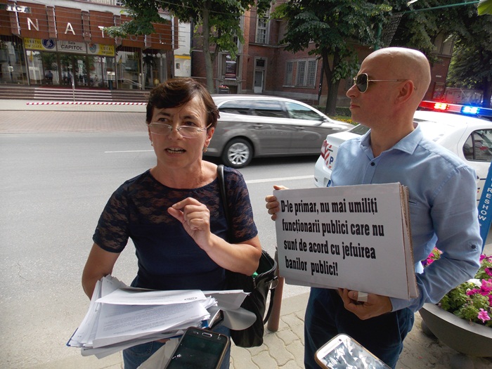Marti dupa-amiaza, functionara a protestat in fata institutiei cu mesaje scrise pe cateva pancarte, si i s-au alaturat si cativa prieteni.