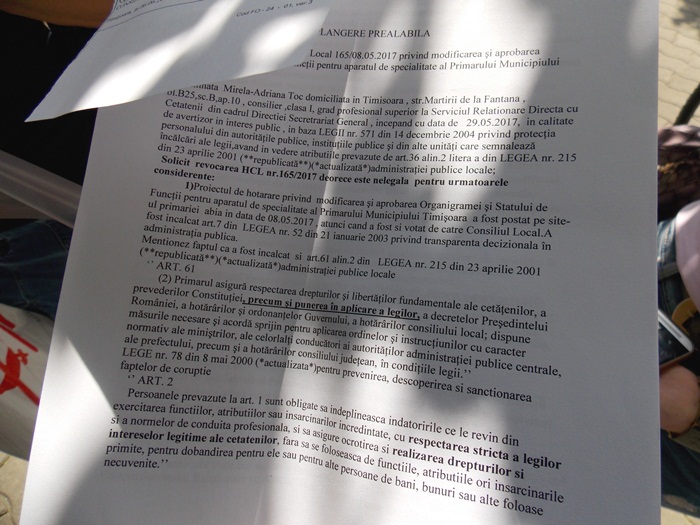 Este vorba despre angajata municipalitatii Mirela Toc. Aceasta sustine ca legea a fost incalcata grosolan, ca a facut sesizari de mai multe ori in acest sens si ca a fost mutata de la un departament la altul, dupa ce Consiliul Local a aprobat noua organigrama a Primariei Timisoara.