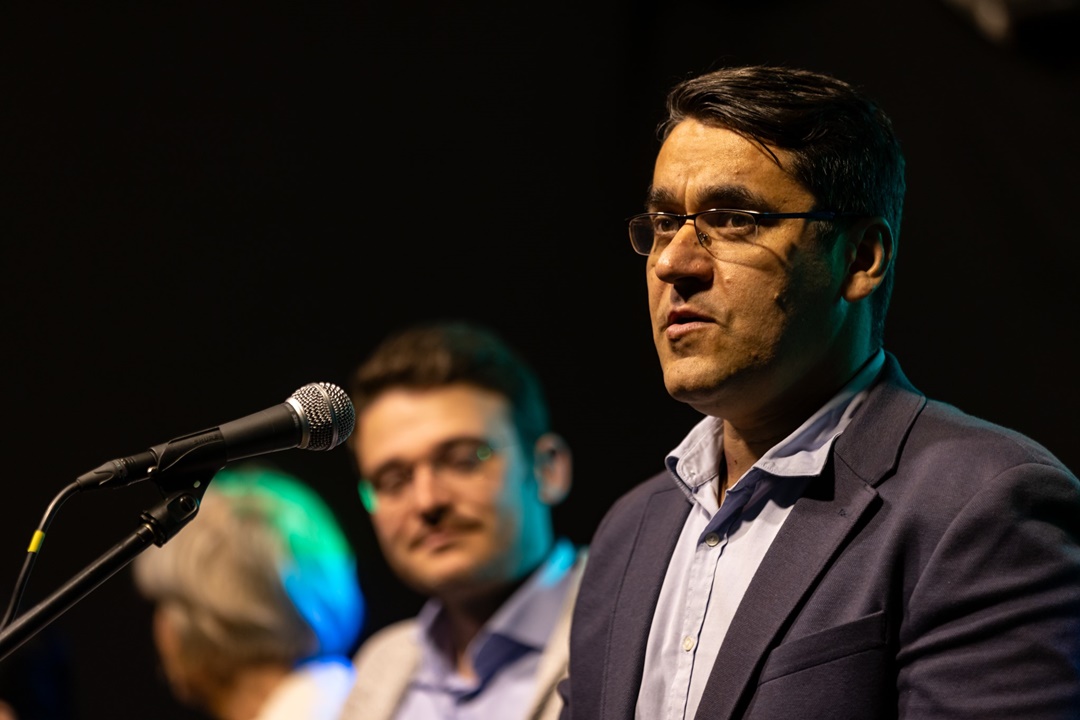 “Prima interactiune cu Elena a fost un mesaj foarte scurt: avem un proiect in care vrem sa introducem un produs tehnic intr-o instalatie de arta. Pentru noi lumea tehnica e foarte aproape, arta e… un pic mai departe. Inginerii nostri sunt foarte stricti si pragmatici, insa am realizat, impreuna cu Elena, uitandu-ne la catalogul de produse, ca avem cateva elemente care se preteaza in instalatii artistice. Si produsul pe care il vedeti aici pe lateral este un produs foarte tehnic, are in spate tehnologii de ultima generatie. Este produs in Lugoj de catre noi, ajunge in toata lumea, si astazi a capatat o veleitate noua, care ne-a surprins si pe noi si arata foarte bine, nu ma asteptam. Si, avand acest punct comun, lumina, oarecum colaborarea a fost simpla, din momentul in care produsul a prins viata in ochii artistului“, spune Gabriel Sirbu, directorul centrului de proiectare si dezvoltare HELLA Special Original Equipment din Timisoara.
