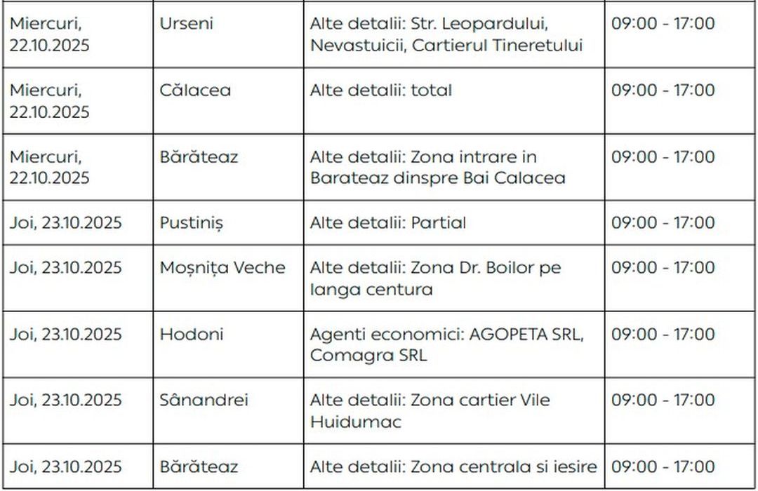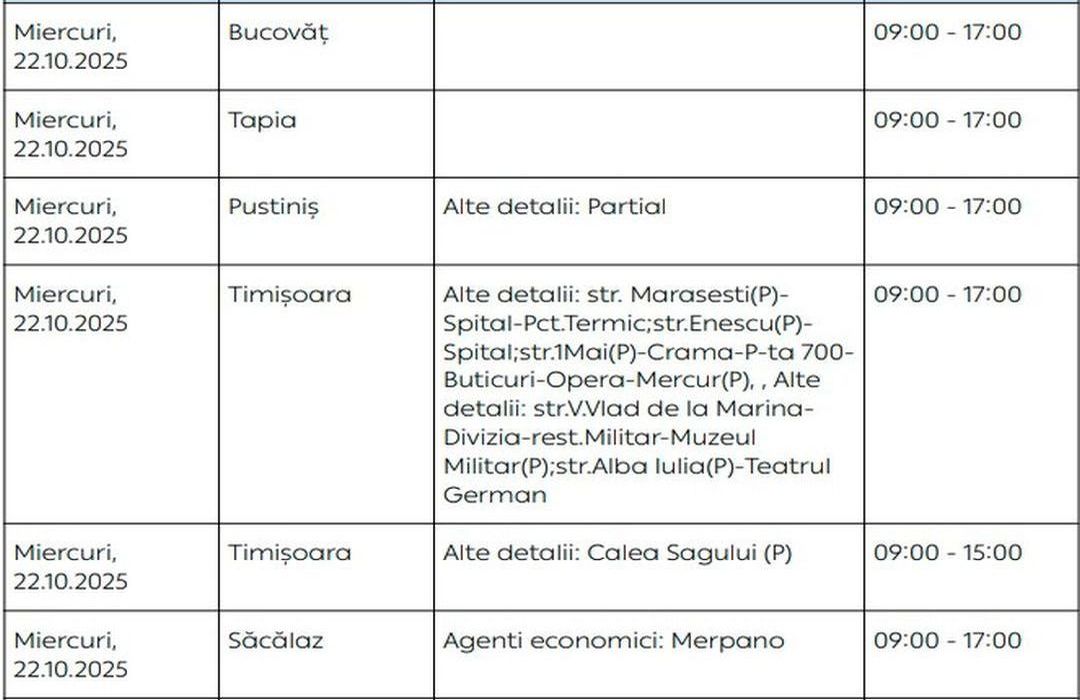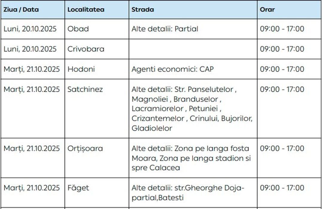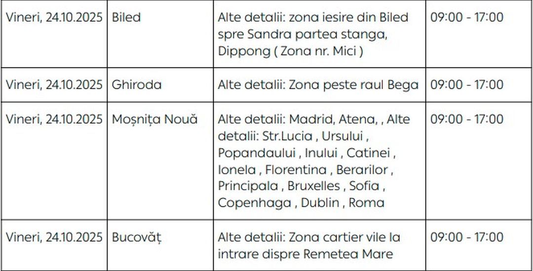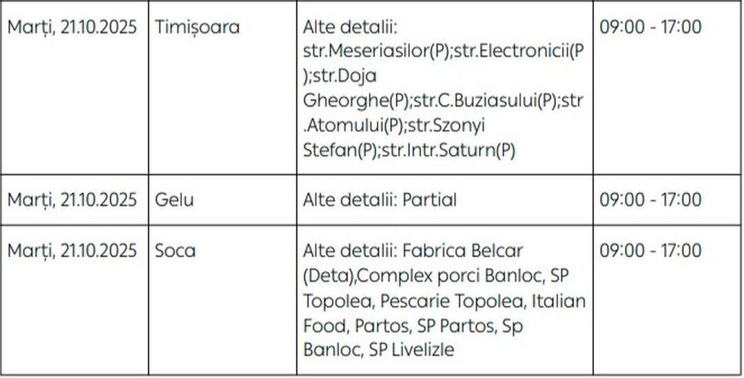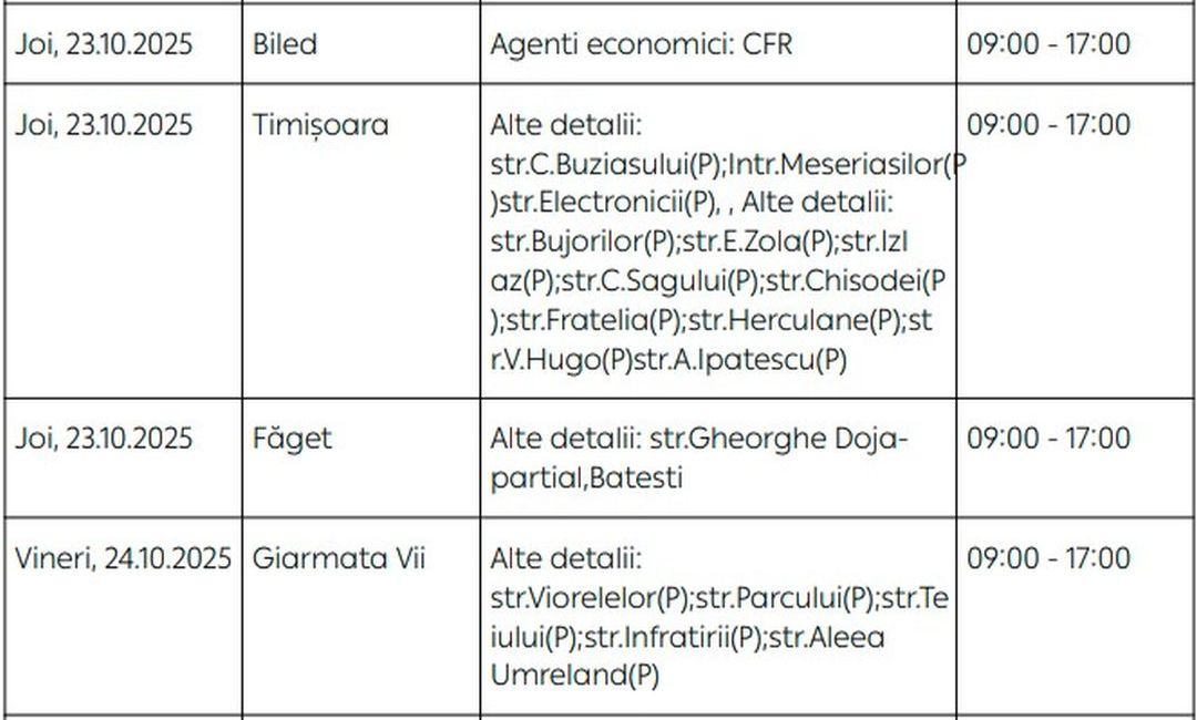 Oamenii vor rămâne fără energie electrică timp de câteva ore pe zi, în săptămâna 20 – 26 octombrie, în mai multe localități din Timiș.