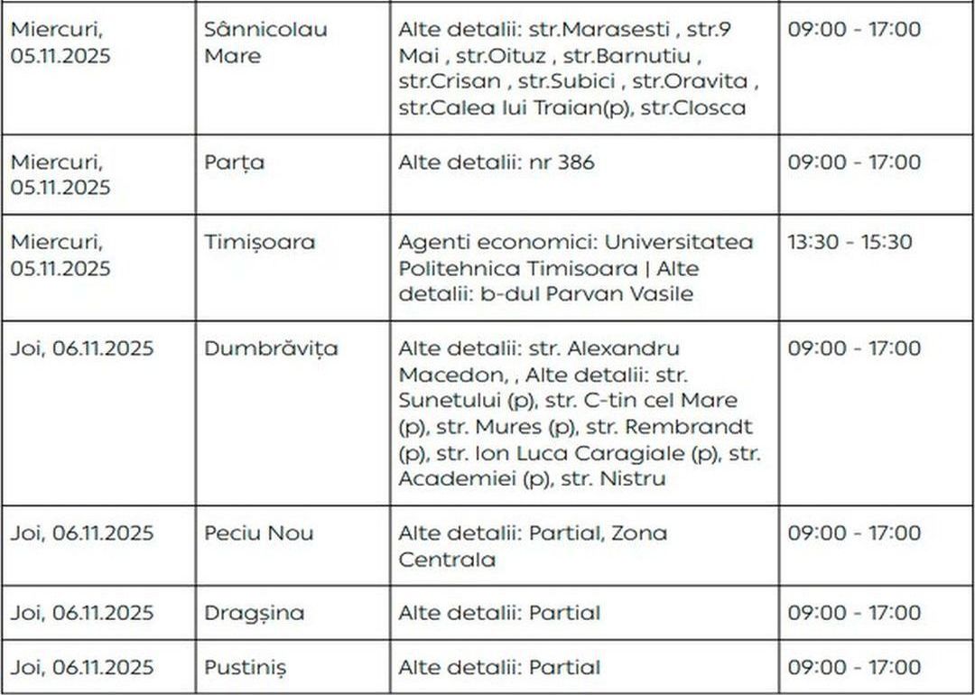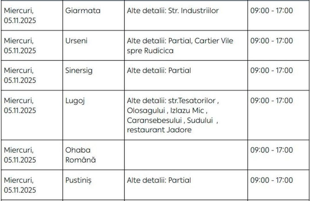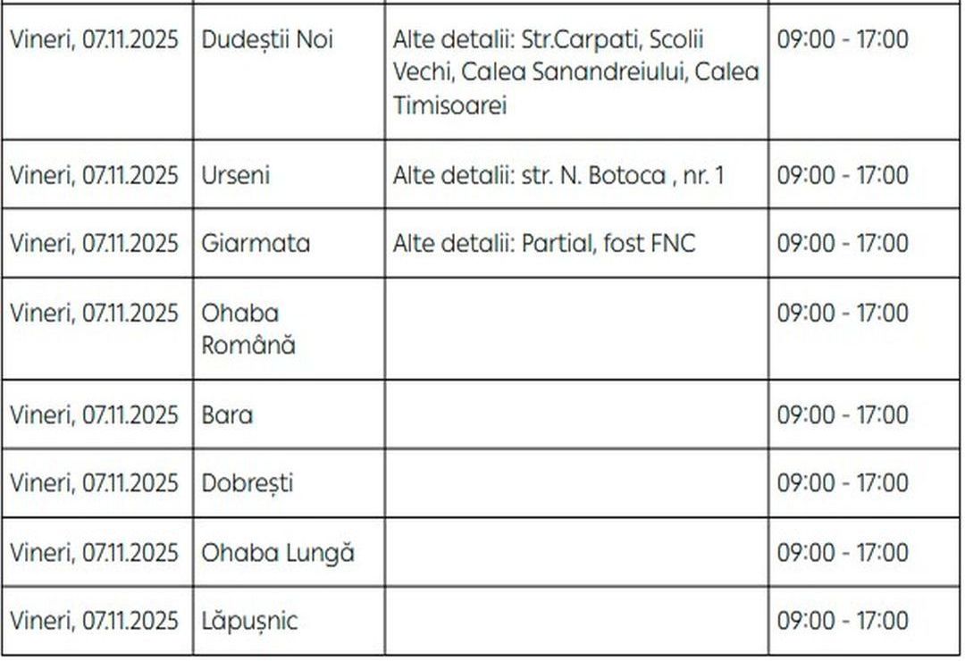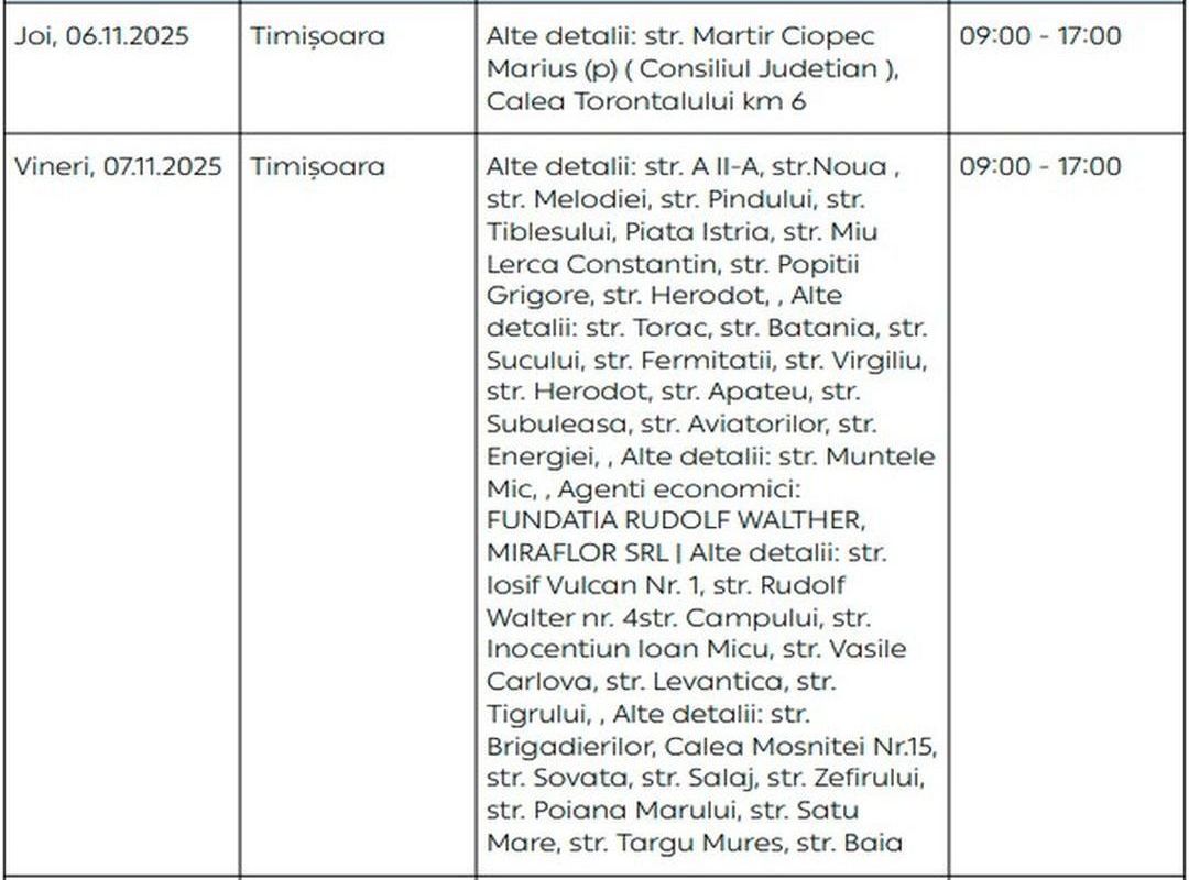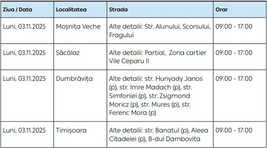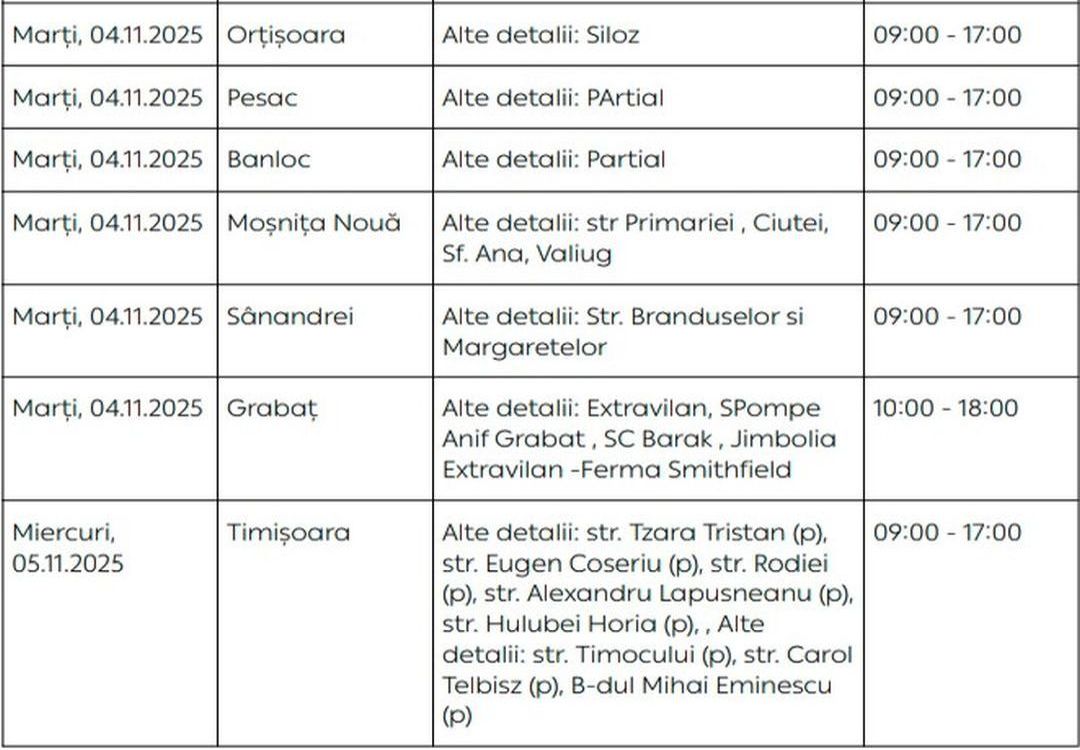 Oamenii vor rămâne fără energie electrică timp de câteva ore pe zi, în săptămâna 3 – 9 noiembrie, în mai multe localități din Timiș.