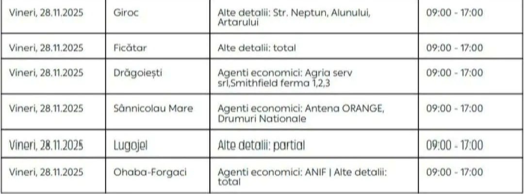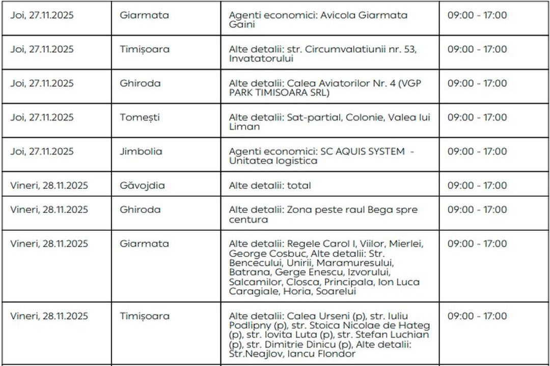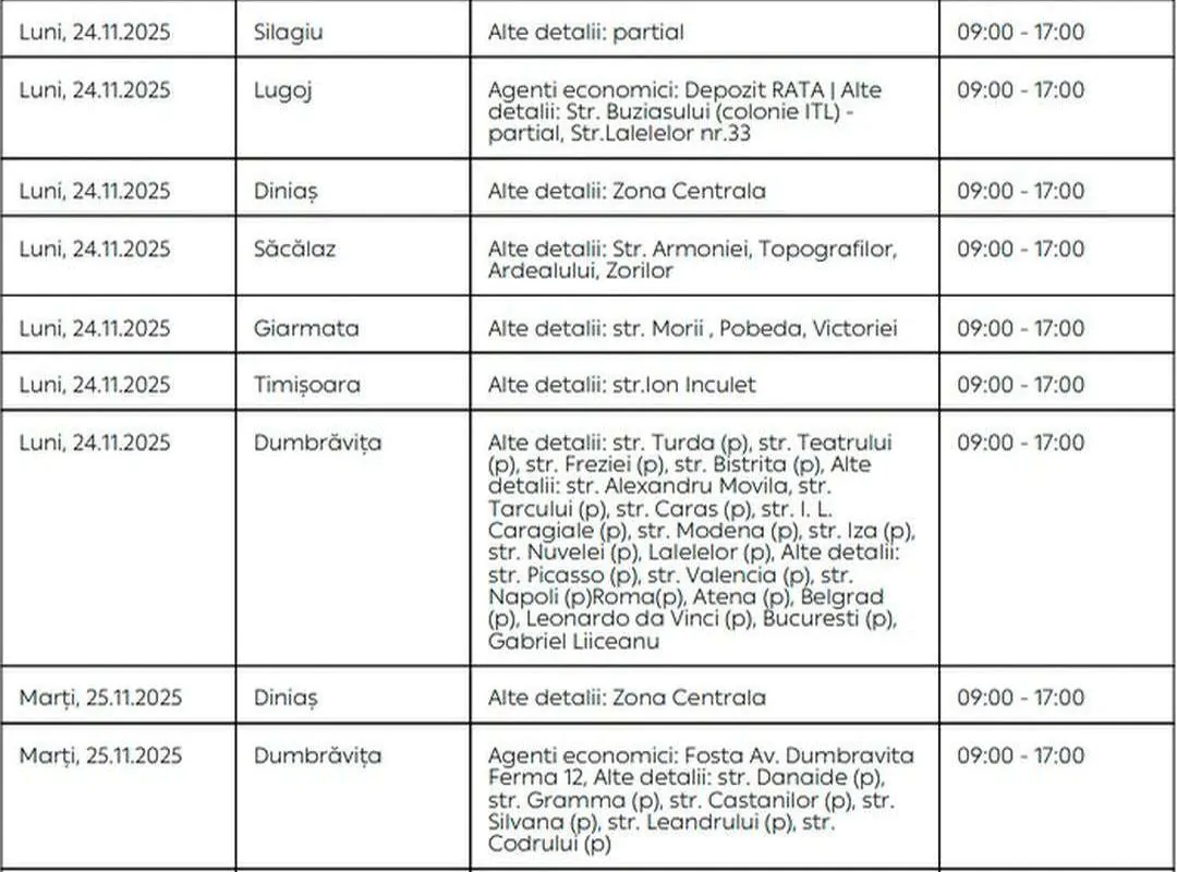 Oamenii vor rămâne fără energie electrică timp de câteva ore pe zi, în săptămâna 24 – 30 noiembrie, în mai multe localități din Timiș.