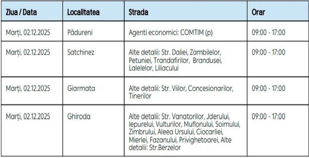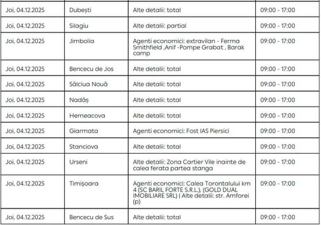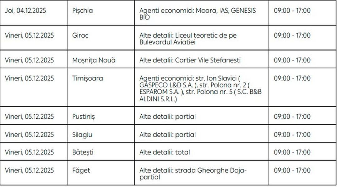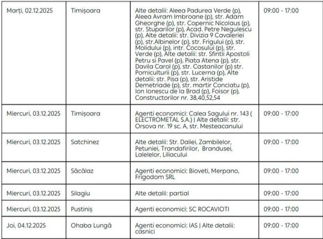 Oamenii vor rămâne fără energie electrică timp de câteva ore pe zi, în săptămâna 1 – 7 decembrie, în mai multe localități din Timiș.