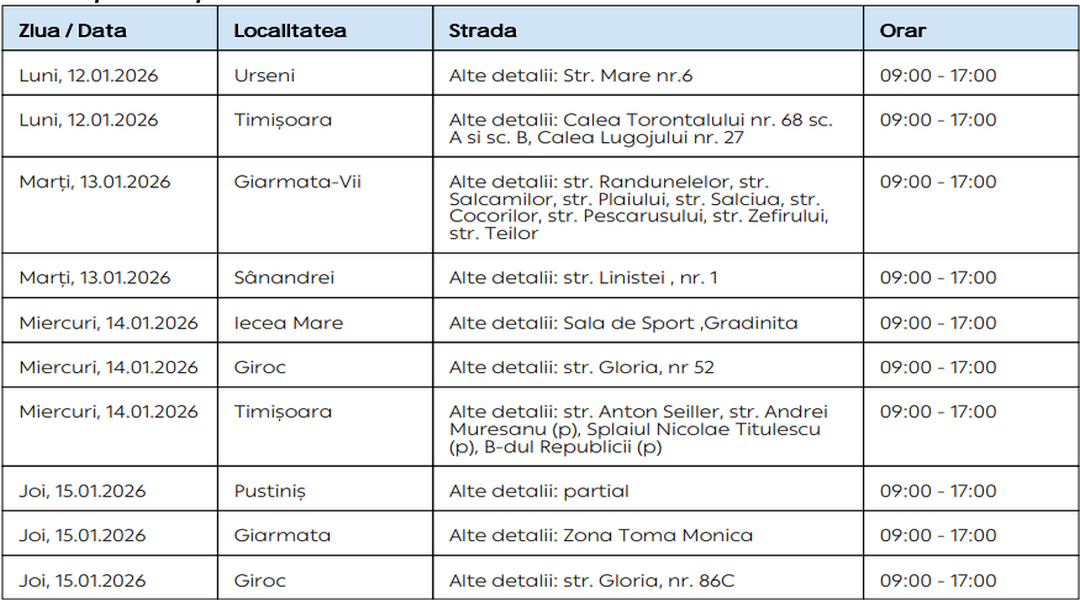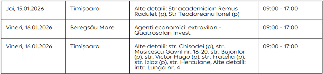 Oamenii vor rămâne fără energie electrică timp de câteva ore pe zi, în săptămâna 12 – 18 ianuarie, în mai multe localități din Timiș.