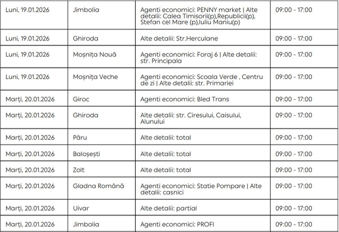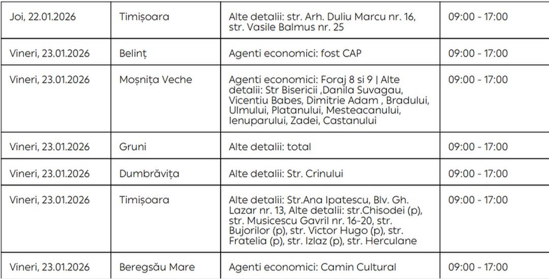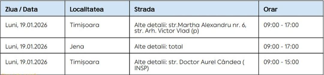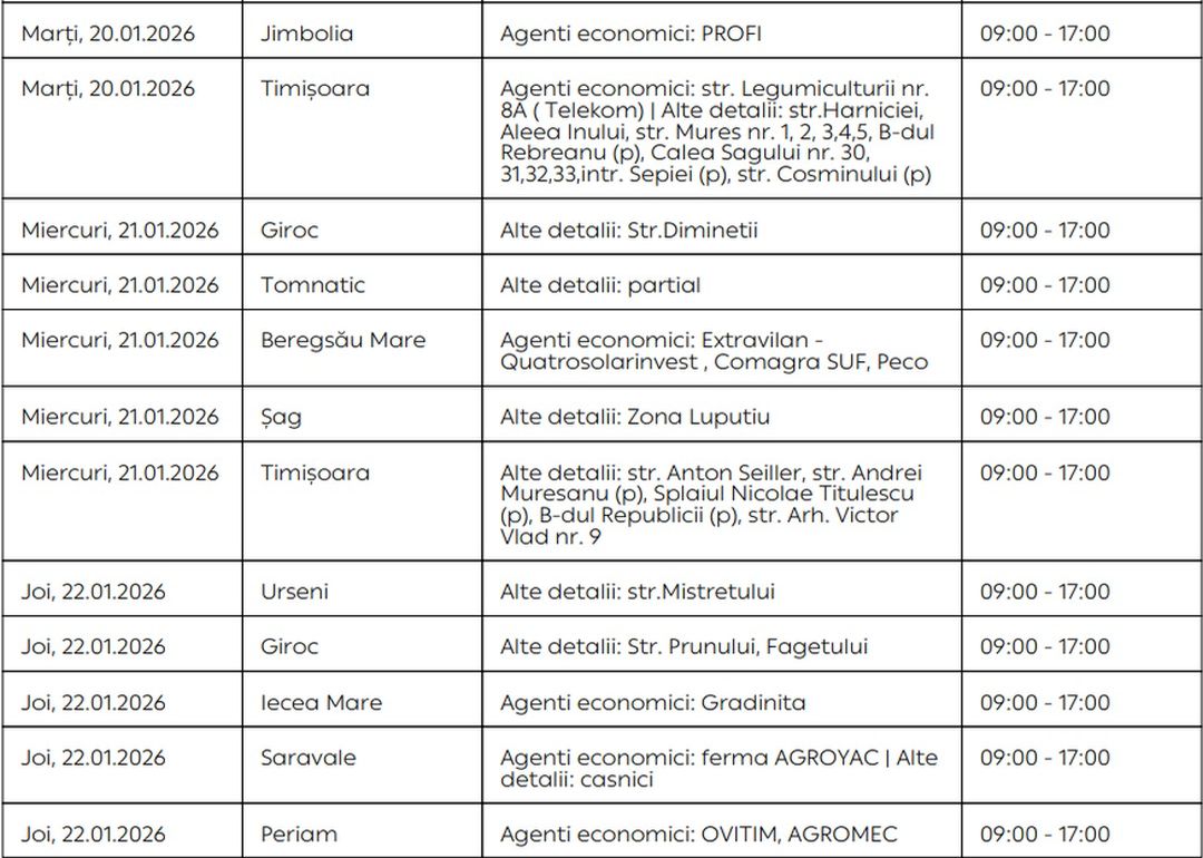 Oamenii vor rămâne fără energie electrică timp de câteva ore pe zi, în săptămâna 19 – 25 ianuarie, în mai multe localități din Timiș.