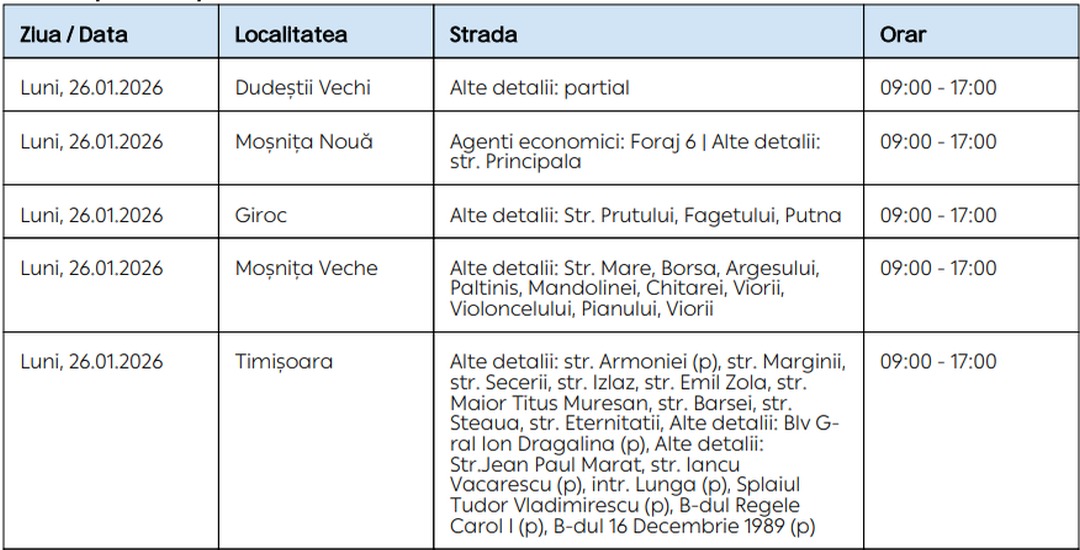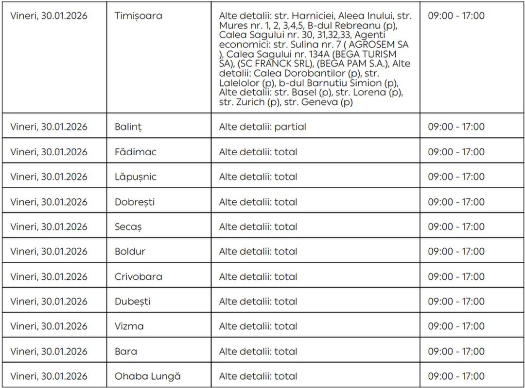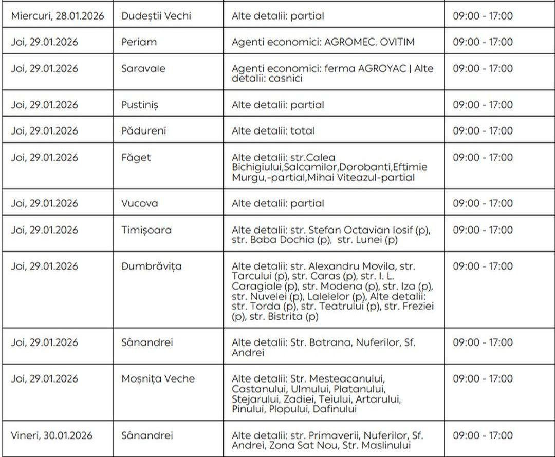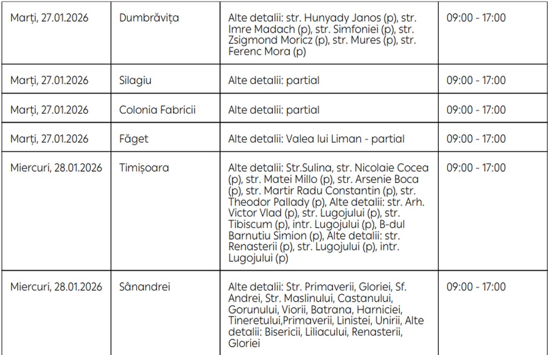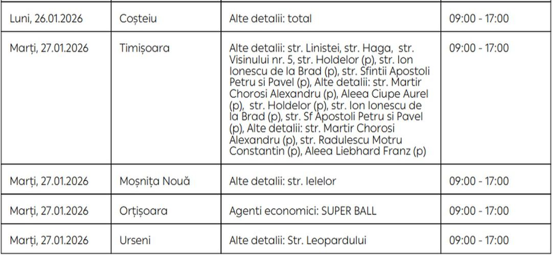 Oamenii vor rămâne fără energie electrică timp de câteva ore pe zi, în săptămâna 26 ianuarie – 1 februarie, în mai multe localități din Timiș.