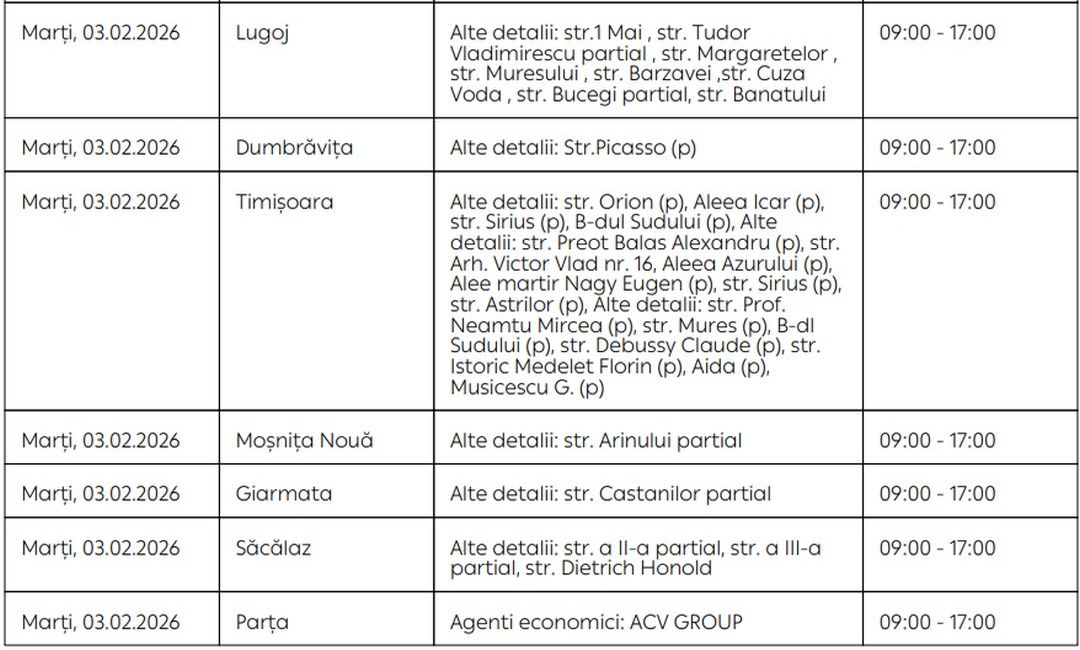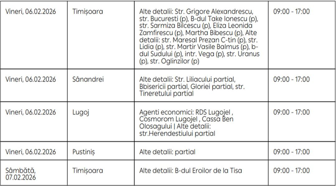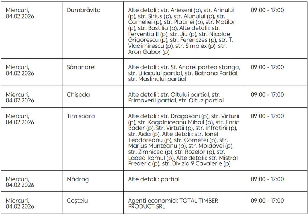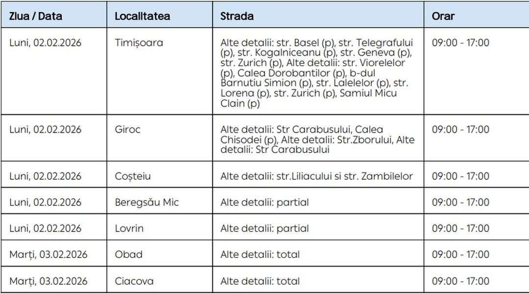 Oamenii vor rămâne fără energie electrică timp de câteva ore pe zi, în săptămâna 2 – 8 februarie, în mai multe localități din Timiș.
