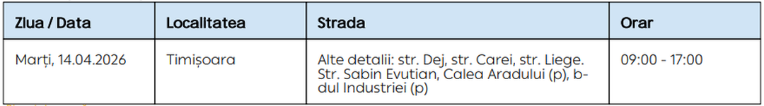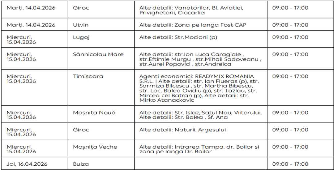 Oamenii vor rămâne fără energie electrică timp de câteva ore pe zi, în săptămâna 13 – 19 aprilie, în mai multe localități din Timiș.