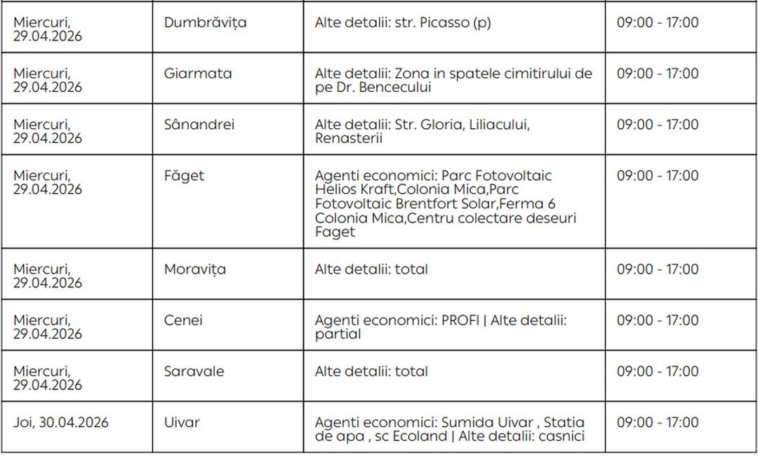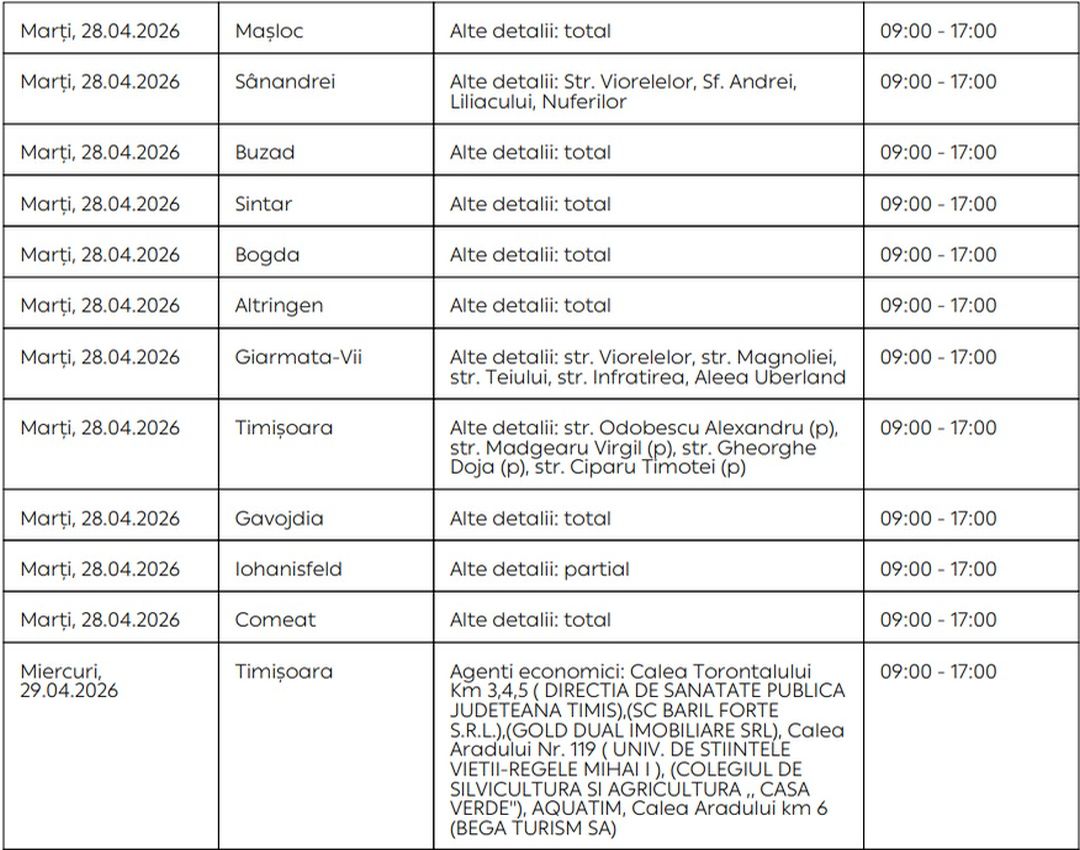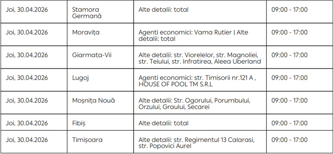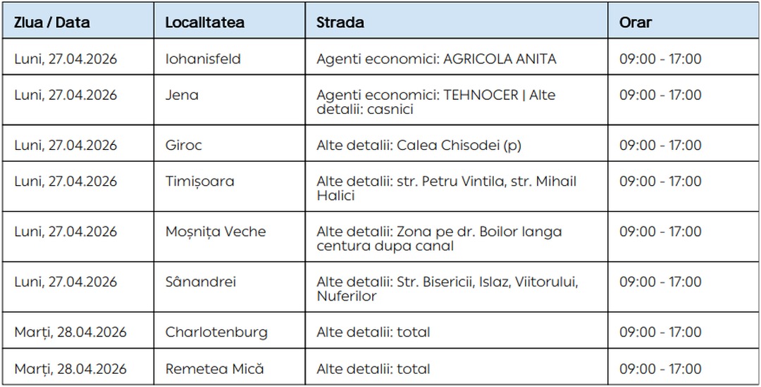 Oamenii vor rămâne fără energie electrică timp de câteva ore pe zi, în săptămâna 27 aprilie – 3 mai, în mai multe localități din Timiș.