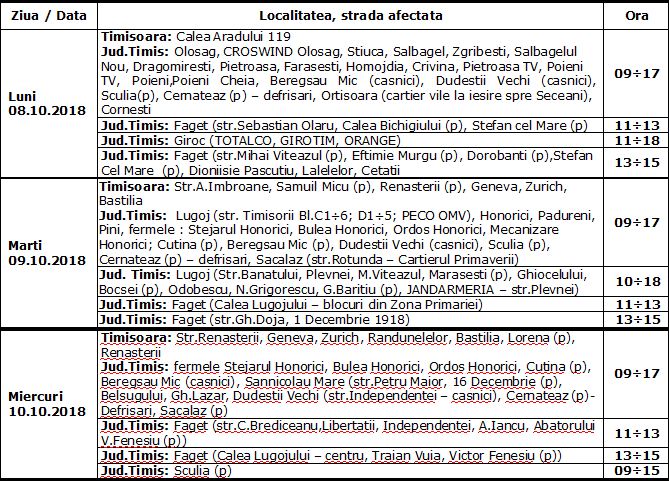 TIMISOARA. Reprezentantii Enel fac lucrari de revizii, reparatii si modernizari in reteaua de distributie, astfel ca, in perioada urmatoare va fi nevoie sa intrerupa furnizarea curentului electric. Atat in Timisoara, cat si in judet intre 8 si 13 octombrie.