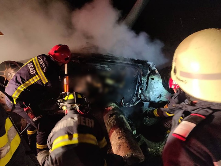 ‘Autoturismul s-a rasturnat si a luat foc. In momentul sosirii celor 4 echipaje de interventie a Detasamentului de Pompieri Arad, 1 echipaj de stingere, 1 descarcerare si 2 SMURD, autoturismul ardea generalizat. Dupa lichidarea incendiului au fost gasite 2 victime, decedate‘, au transmis reprezentanii ISU Arad.