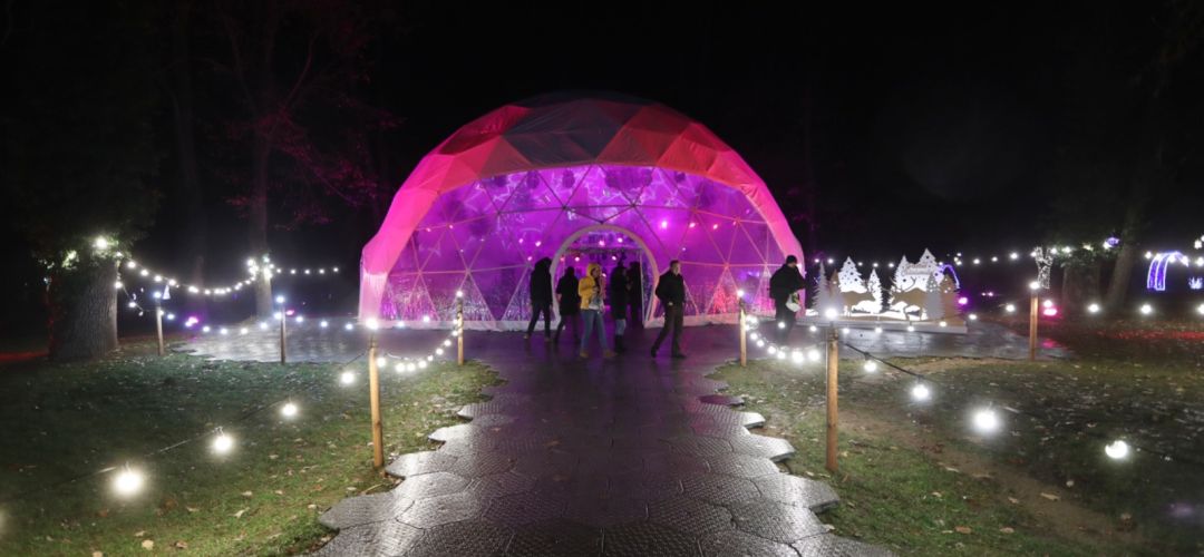 Timisorenii sunt intampinati cu o multime de ornamente luminoase ce se intind de-a lungul aleilor din muzeu.