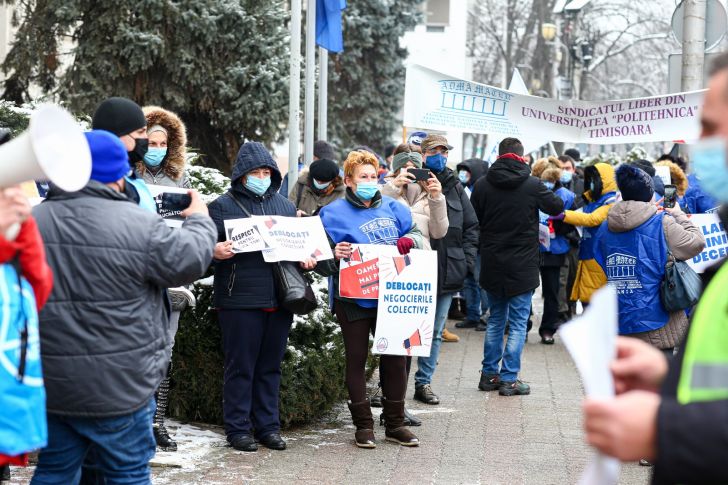 Angajatii din sanatate, din Primaria Timisoara, de la Politia de Frontiera si din mediul universitar care fac parte din Cartel Alfa, echipati cu steaguri si pancarte, au mers in fata Prefecturii Timis pentru a-si striga nemultumirile.