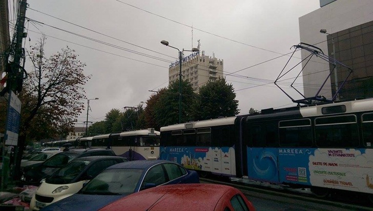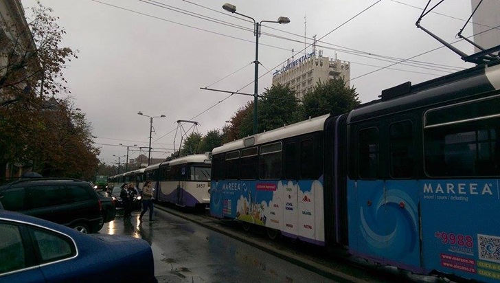 TIMISOARA. Coloana de tramvaie blocate pe linie dinspre Piata Traian catre Piata Libertatii, marti, la orele pranzului.
