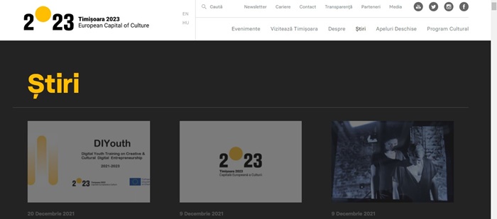 Incepand de joi website-ul Asociatiei Timisoara Capitala Europeana a Culturii 2023 are o noua fateta care inglobeaza noi functionalitati, sectiuni in limba romana, limba engleza si maghiara, dar mai ales, o imagine care sa reprezinte promovarea Programului Cultural al Timisoarei 2023, Capitala Europeana a Culturii, in ansamblul sau. Oferind publicului informatii despre concept, programe-cadru si calendar, intr-un mod unitar, iar partenerilor solutii grafice si un suport profesional in comunicarea cu presa si cu publicul larg, migrarea noului website pe o adresa noua semnifica si adaptarea la noile formule premergatoare pregatirilor pentru primirea titulaturii Timisoarei de Capitala Europeana a Culturii in anul 2023.