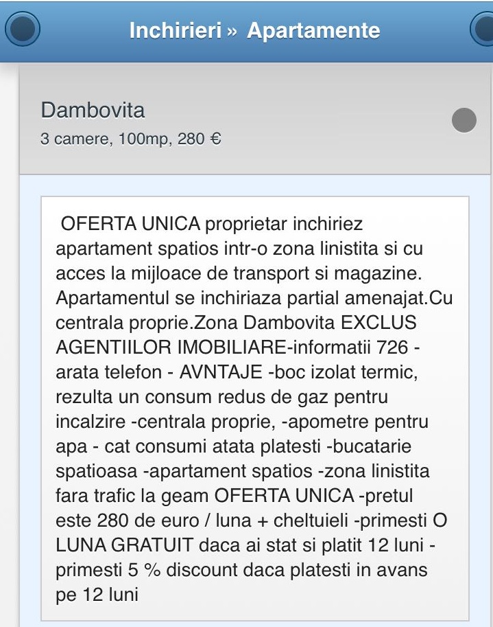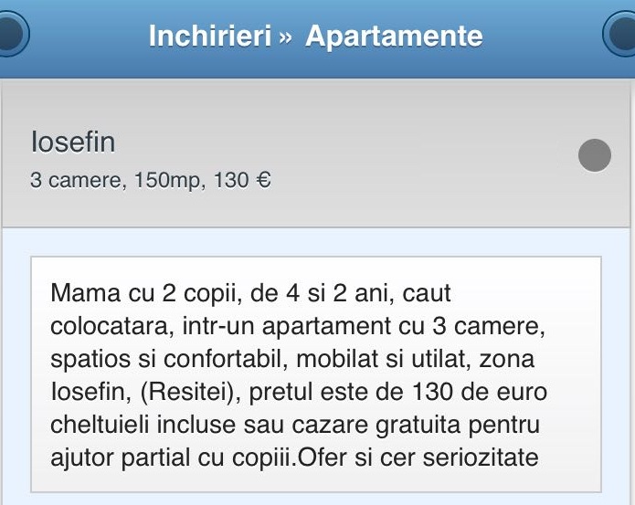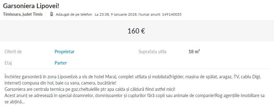 “Intr-un alt caz m-am confruntat cu o situatie de-a dreptul hilara. Proprietarul a tinut sa precizeze in anunt, dar mi-a cerut chiar expres sa le povestesc potentialilor clienti ca in vecinatatea blocului in care avea apartamentul se gaseste un frumos loc de joaca pentru copii, insa nu a acceptat niciun client cu copii in casa lui“, a adaugat agentul imobiliar.