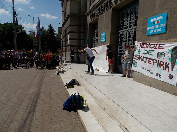 TIMISOARA. Protest al iubitorilor de sporturi extreme la Timisoara! Aproape 100 de tineri s-au adunat pe platoul din fata Prefecturii unde si-au strigat nemultumirea ca in atatia ani autoritatile si-au dovedit neputinta de a amenaja un loc special pentru ei, aceasta dupa ce l-au daramat pe cel vechi din vecinatatea Parcului Central.
