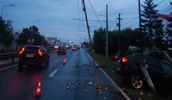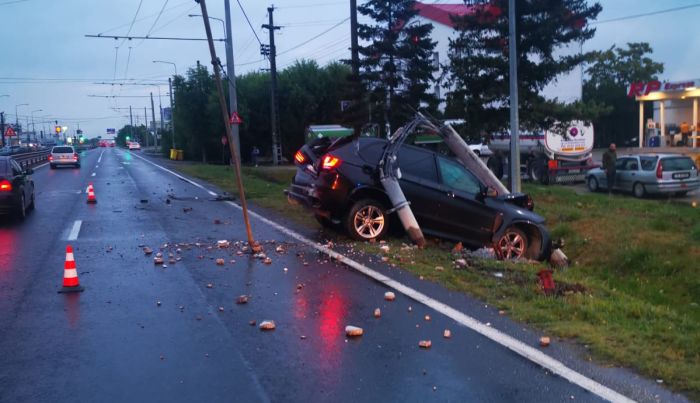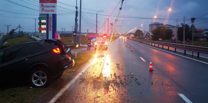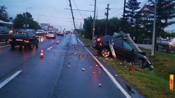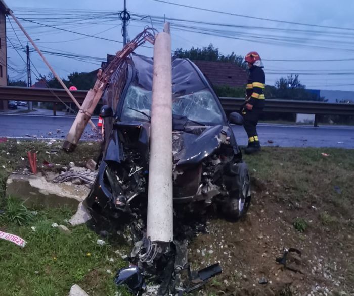 Un barbat care circula cu masina dispre Timisoara spre Ghiroda si care, cel mai probabil, nu a adaptat viteza pentru a circula in siguranta pe ploaie, a intrat in plin cu masina intr-un stalp, pe l-a retezat de la baza si care, apoi, s-a prabusit peste autoturism.