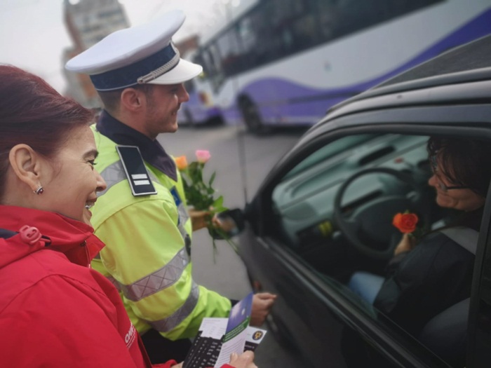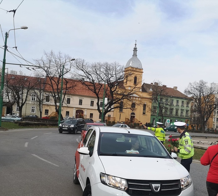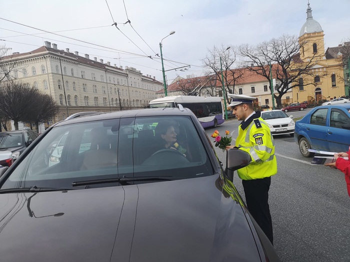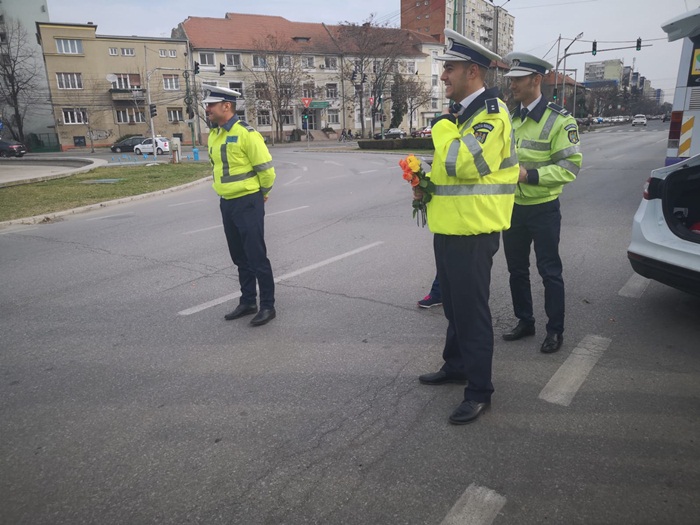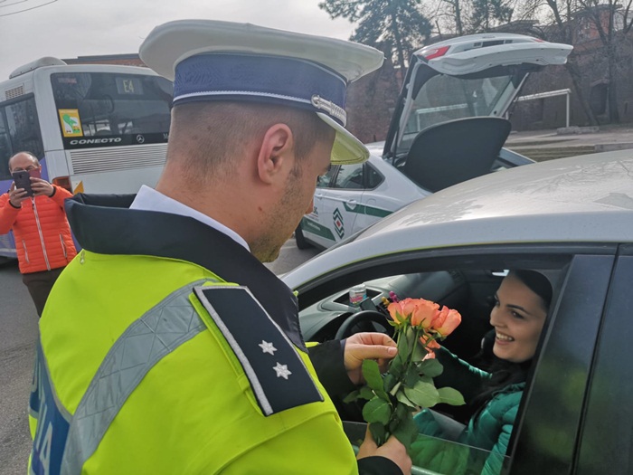 In loc sa le legitimeze pentru a acorda vreo sanctiune, oamenii legii le-au oferit cate o floare si le-au urat o primavara frumoasa reprezentantelor sexului frumos.