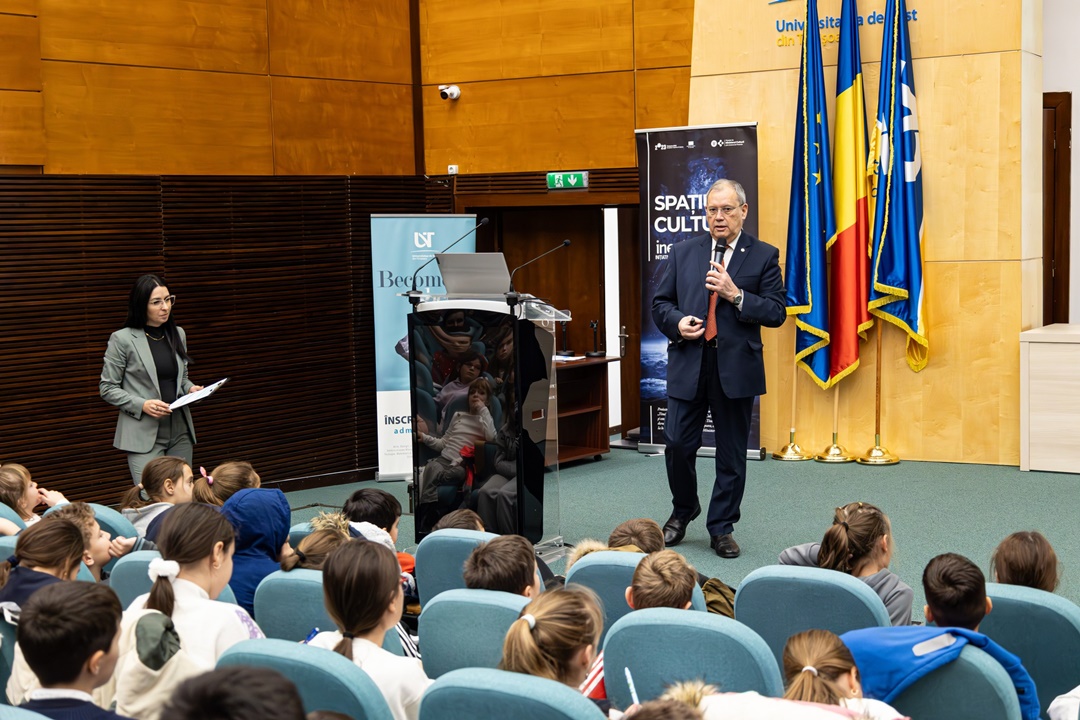 Cosmonautul Dumitru Prunariu, primul și singurul român care a ajuns în spatiu, de ale cărui prezență și cunoștințe s-au bucurat peste 250 de elevi din Timișoara, într-o întâlnire special dedicată lor.