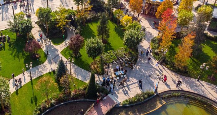 În această perioadă, întregul areal impresionează prin coloritul frunzelor diverselor specii de copaci și arbuști. Teii, fagii pendulari și piramidali, platanii, arțarii, stejarii și castanii și-au îmbrăcat hainele toamnei, puse în valoare de contrastul cu gazonul verde. Superbul cadru natural oferit de cei peste 10.000 de arbuşti şi 1.400 de arbori de talie mare, lumina caldă reflectată de lac, foișorul și piațetele creionează un tablou de poveste, care invită la plimbări îndelungate și fotografii creative.