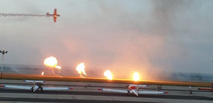 Au evolutat apoi parasutistii Blue Wings si formatia de zbor cu avioane ultra usoare The Pelicans, urmati de Iacării Acrobati, sau Banditii Aerului, care au decolat alaturi de pilotul lituanian Jurgis Kairys si care au uimit spectatorii cu elemente de acrobatie aeriana si efecte pirotehnice.