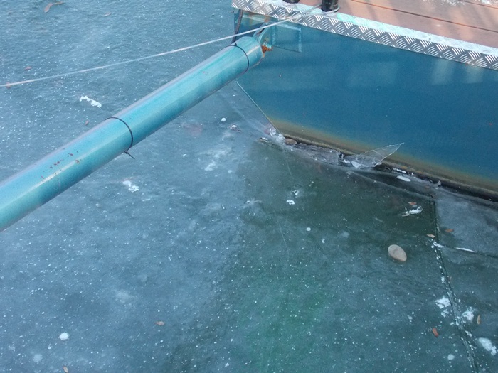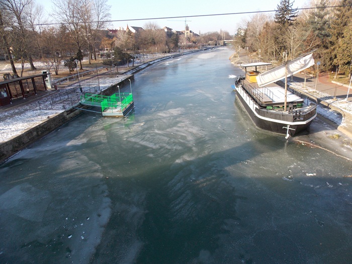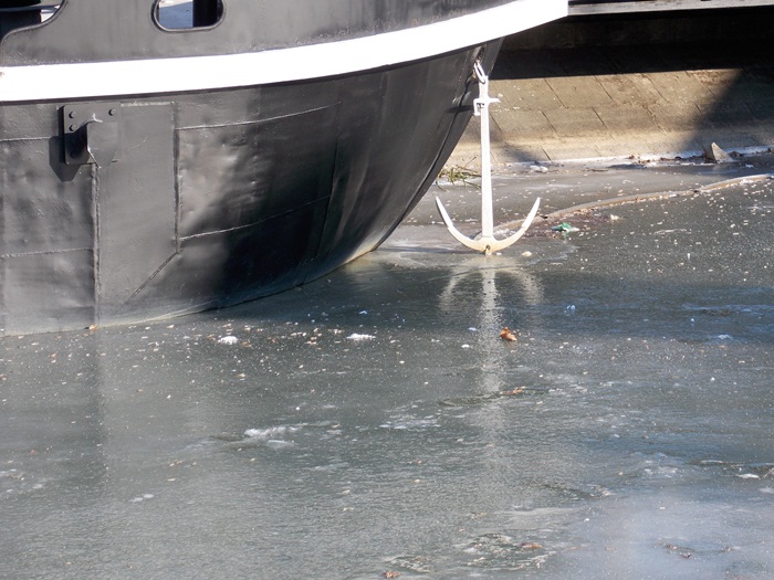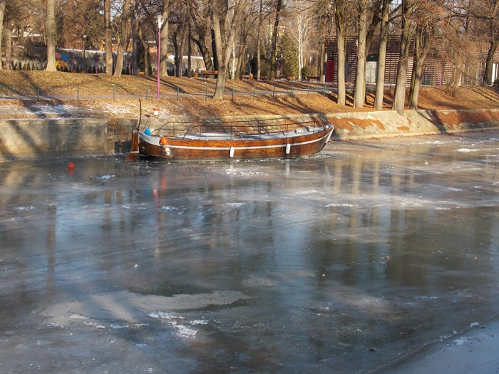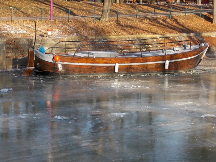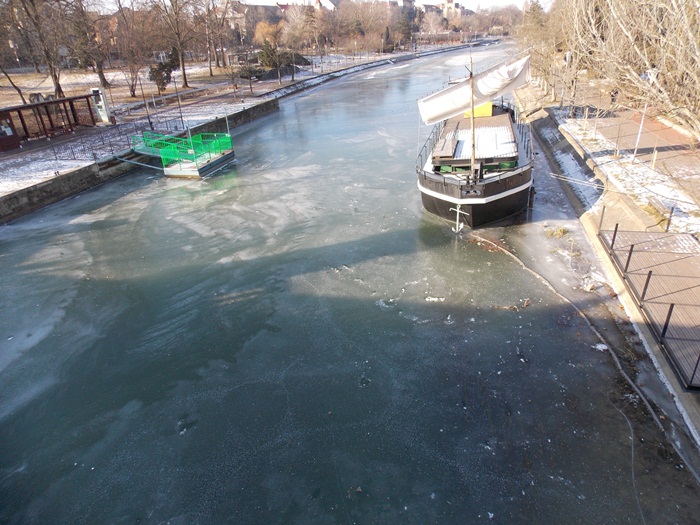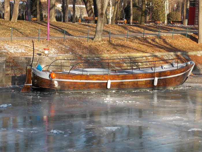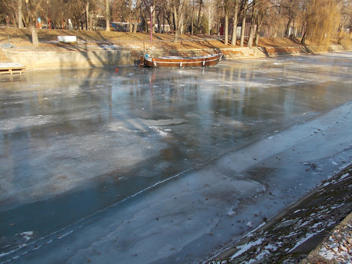 Si daca vaporasele primariei au fost scoase de pe rau inainte de venirea gerului, cele care au ramas pe canal sunt blocate in gheata.