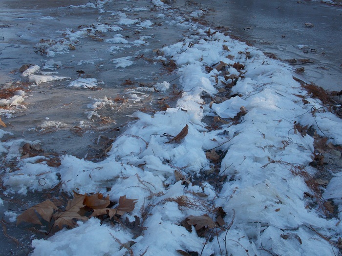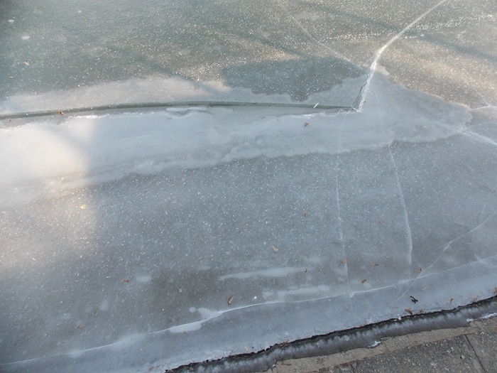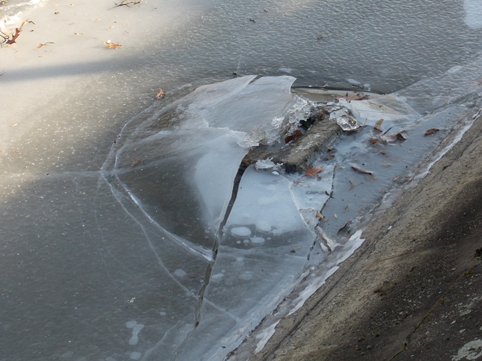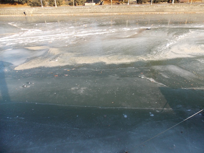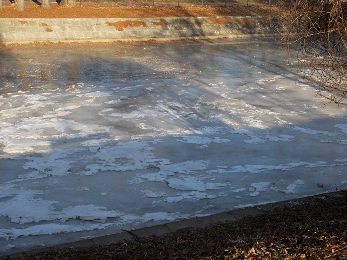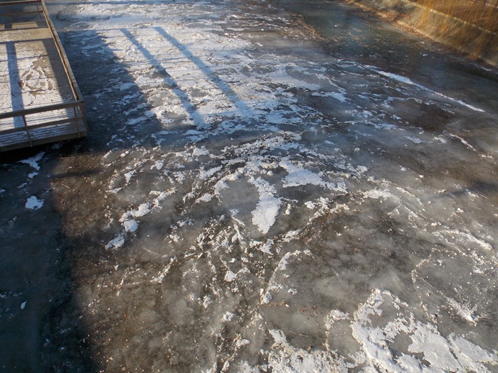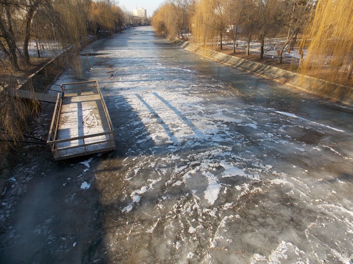 Pe ici pe colo au ramas farame de zapada pe gheturile formate pe canal, iar apa a ramas incremenita in tot felul de forme ce sclipesc in soare.