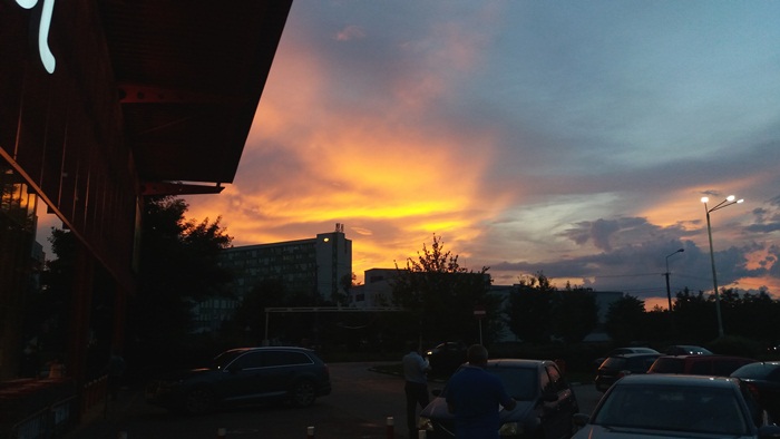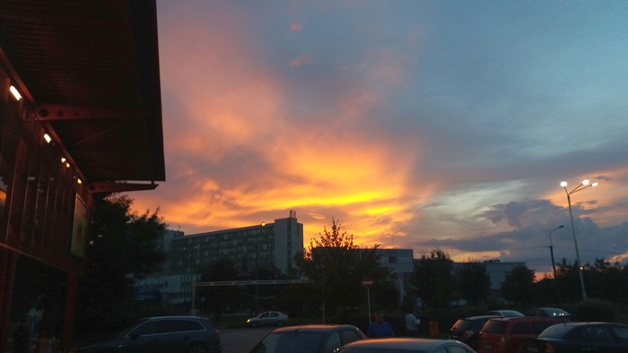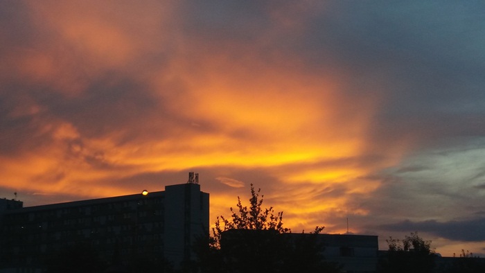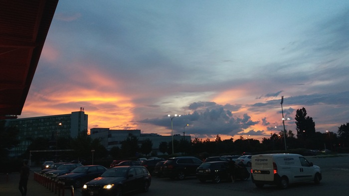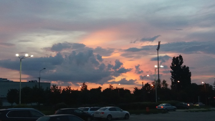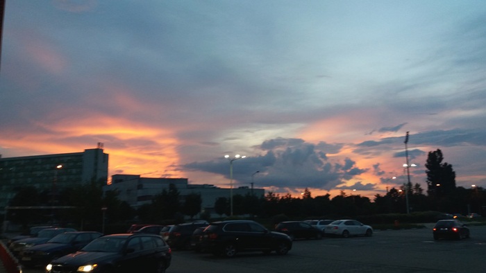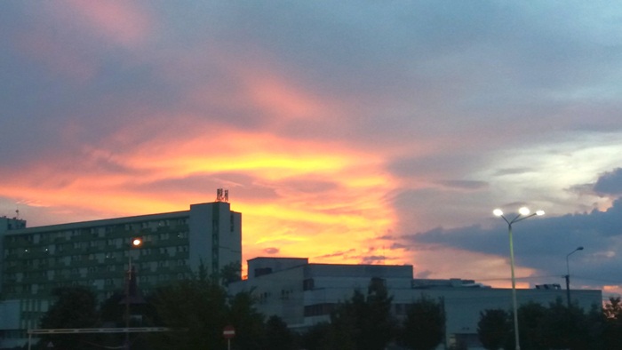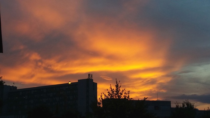 Apusul de soare a colorat cerul Timisoarei si a luminat norii ce se imprastiau dupa ce au dezlantuit pret de doua ore ploaia peste oras. Cerul parea ca a luat pur si simplu foc.