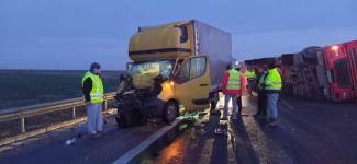 Accident intre doua tiruri si o dubita pe autostrada Timisoara – Arad. Autotren rasturnat. Foto