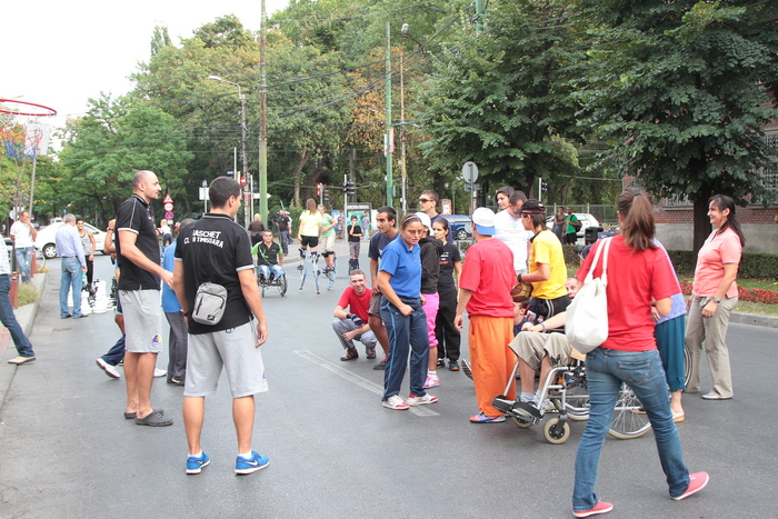 TIMISOARA. Mai multi timisoreni cu dizabilitati s-au adunat miercuri dupa-amiaza pe strada din fata Primariei Timisoara, care a fost inchisa circulatiei vreme de 2 ore. S-au jucat baschet si au fost premiati, s-au plimbat pe picioroange, s-au intrecut la ping-pong, sah si au avut parte de demonstratii de sport extrem.